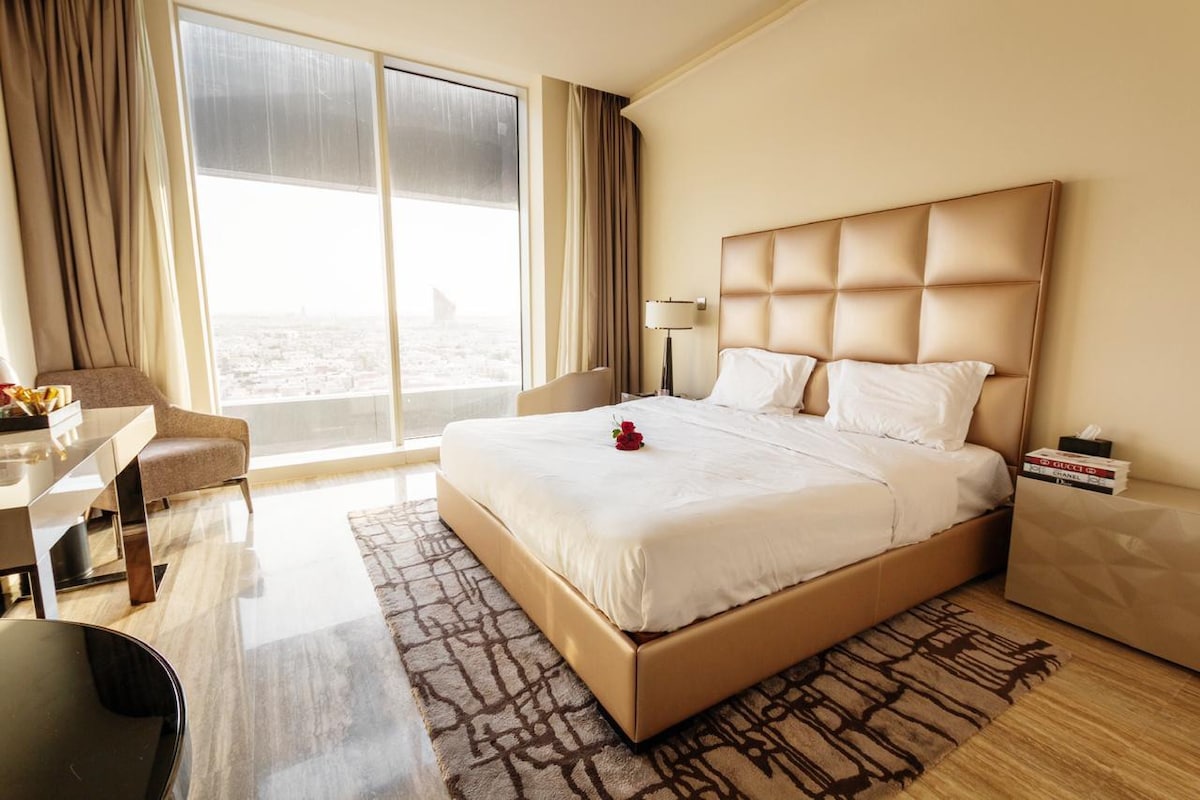 Apartamento en Burj Rafal (residencia del propietario), más de 50 pisos, con vistas al norte, para aquellos que buscan un alojamiento tranquilo y distinguido, cerca de los lugares más destacados de Riad. Totalmente equipado, diseñado y amueblado con lujosos muebles personales; incluye un dormitorio con una cama principal, una cocina, (2) baños, iluminación cinematográfica, una lavadora, cafetera, TV de 75 pulgadas y pantalla grande en el dormitorio, filtro purificador de aire, utensilios de cocina para pasar un período de estancia con total comodidad.