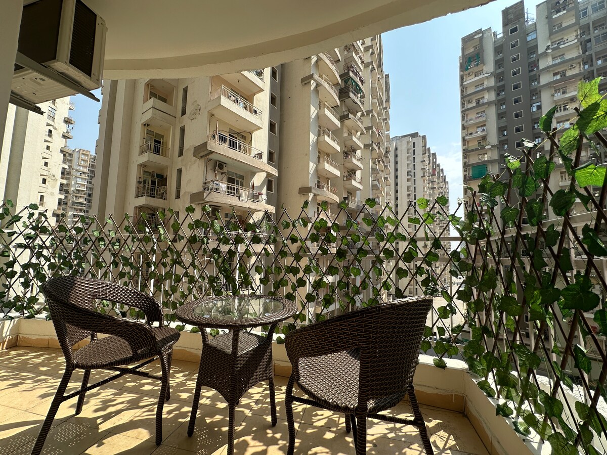 Bienvenido a PEBBLESTAY. Un espacioso departamento de 3 dormitorios que es perfecto para familias y amigos, de los cuales 2 de ellos se abren a balcones privados con 2 baños. Una sala de estar única con una impresionante pared decorativa cubierta de flores que agrega un toque de naturaleza al espacio. Ya sea que estés relajándote en interiores o tomando algunas fotos, esta pared única es la favorita de los huéspedes. Hay una zona de trabajo exclusiva con wifi de alta velocidad, ideal para trabajar a distancia. A 25-30 minutos en auto del Expo Centre Noida.