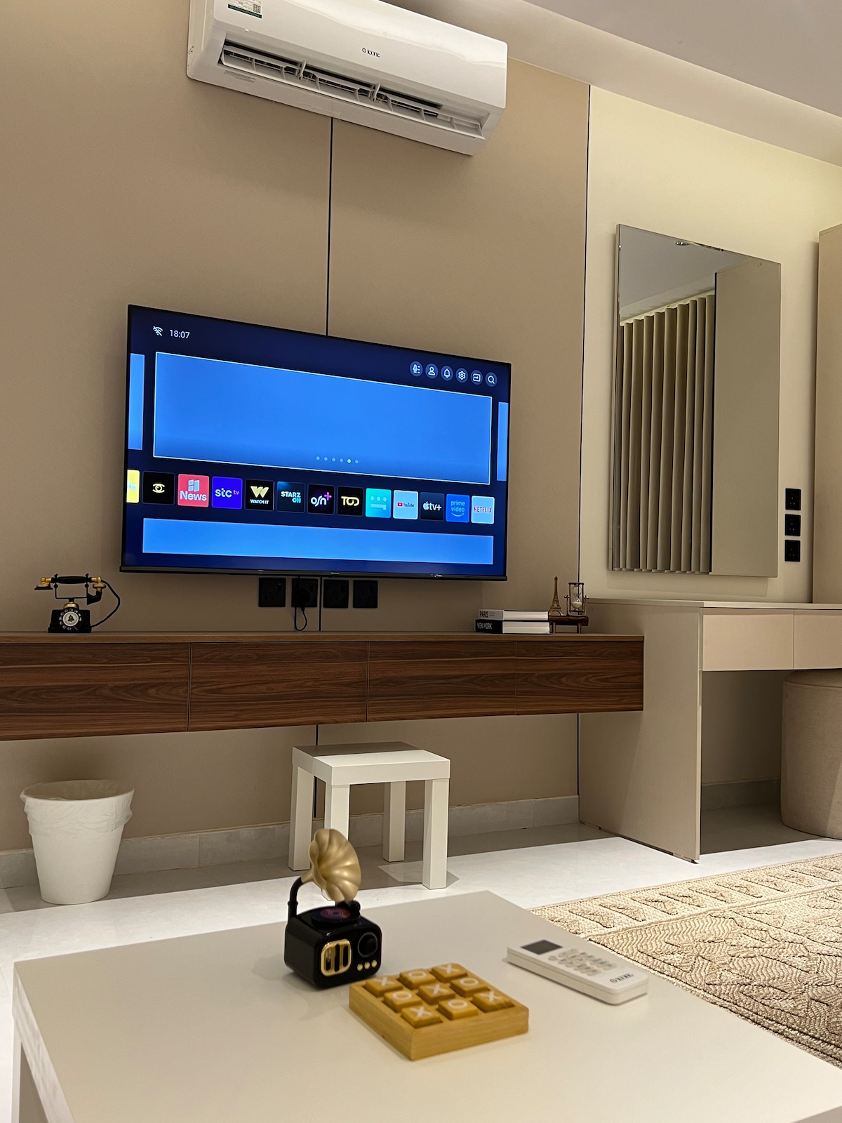 Bienvenido a The Mahdia Studio, una experiencia de alojamiento moderna y cómoda en el corazón de Mahdia, Riad. Un estudio espacioso e iluminado con un diseño que consta de: - Una gran área de cama y un cómodo colchón que garantizan un sueño tranquilo. - Elegante sala de estar con un cómodo sofá, un televisor inteligente. - Esquina de maquillaje clásica con espejo elegante. - Una sesión de lectura lateral con una silla moderna. - Una pequeña mesa de comedor para uso diario. - Decoraciones y toques sencillos que promuevan una sensación de relajación. El lugar es ideal para personas o parejas que buscan una estancia corta y cómoda en uno de los vecindarios más desarrollados y tranquilos de Riad.