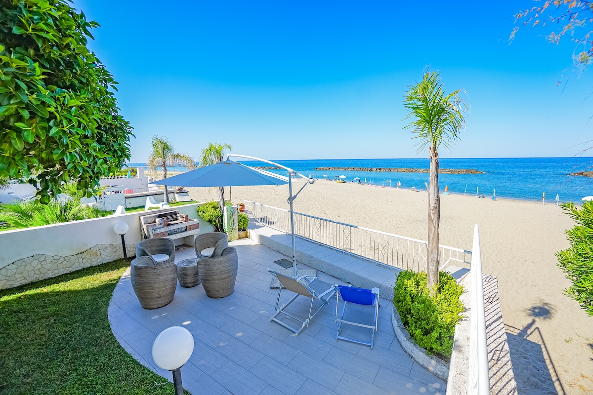 Villa de mar con acceso directo a la playa. A medio camino entre Diamante y Belvedere. Ubicado dentro de un parque privado llamado “Lo Zodiaco”. Dispuesto en 2 niveles: en la planta baja, un baño con lavadora, una cocina y una sala de estar con sofá de TV. Arriba, hay un baño con una gran ducha y 3 dormitorios. En general, tiene capacidad para 7 personas. Zona exterior: gran patio para comer al aire libre con mesa y parrilla, jardín con mecedora/tumbona y escalera para bajar a la playa.