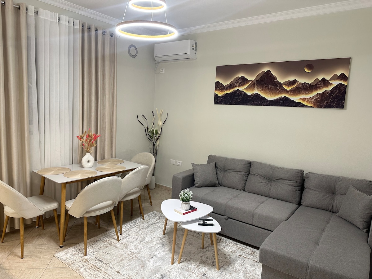 ¡Te damos la bienvenida a tu tranquilo alojamiento en Tirana! Ubicado en el tranquilo barrio de 5 Maji. El departamento cuenta con: ✨ 2 dormitorios completamente amueblados diseñados con un toque cálido y moderno, ideal para parejas, familias o grupos de amigos. 🌄 Un balcón con una impresionante vista a la montaña Dajti, perfecto para tu café por la mañana o para relajarte por la noche. 🍳 Una cocina totalmente equipada con todos los elementos esenciales necesarios. 🛋️ Una sala de estar luminosa y cómoda para relajarse o trabajar de forma remota. 🚗 Estacionamiento gratuito en el lugar y un barrio tranquilo y seguro.