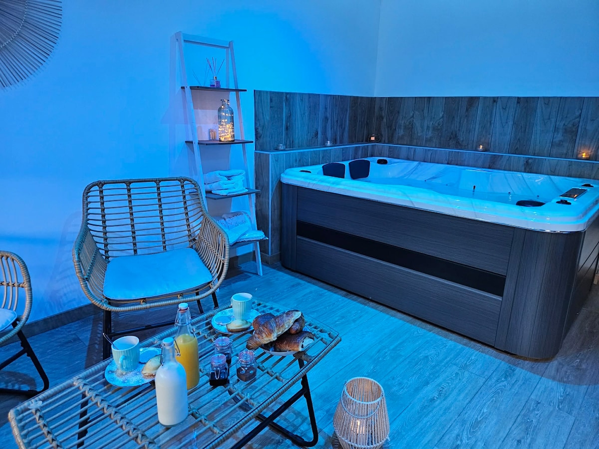 Le ofrecemos una experiencia única en una casa de 60 m2 con muchas comodidades de bienestar (sauna de INFRARROJOS, bañera de hidromasaje, asiento de masaje de 360° ) en el piso de arriba tiene un dormitorio con una gran cama King size 180x200 y la pequeña ventaja en esta escapada romántica será su habitación secreta completamente cautivadora(sillón tantra, espejo, cruz de San Andrés) Tendrá acceso a una cocina totalmente equipada (horno, microondas, dolce gusto, hervidor de agua) Desayuno incluido