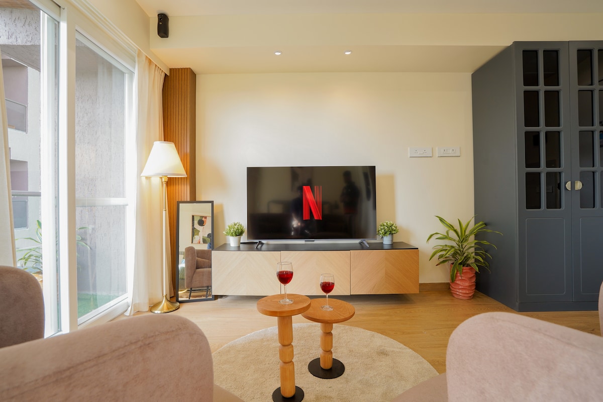 Despiértate con impresionantes vistas al amanecer en The Cozy Cove, un refugio sereno en el municipio de Blue Ridge de Pune. Este moderno apartamento totalmente amueblado cuenta con un acogedor sofá cama, un dormitorio relajante con sábanas suaves y elegantes interiores diseñados para la comodidad y el estilo. Disfruta de Netflix y relájate por las noches en el televisor inteligente, una serena configuración de balcón y una elegante cocina modular equipada para todas tus necesidades. Perfecto para parejas o familias pequeñas, es una escapada tranquila con todas las comodidades del hogar.