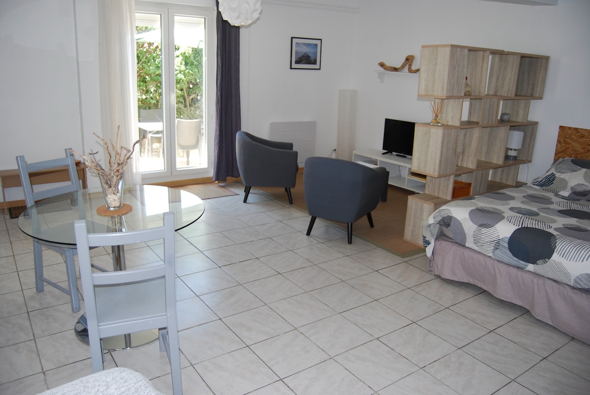 Alojamiento de alta gama, luminoso, luminoso, con jardín privado, soleado y con aire acondicionado. Muy bien equipado (lavavajillas, lavadora secadora, posibilidad de ver DVD con una amplia selección, cafetera) cerca de todos los servicios, aparcamiento gratuito a 10 metros, servicio de transporte a los baños termales a 30 metros, cine y piscina pública a 100 metros. Plano de agua 15 minutos a pie. Acceso independiente. Local seguro para bicicletas (avisar al hacer la reserva que viene con una bicicleta).