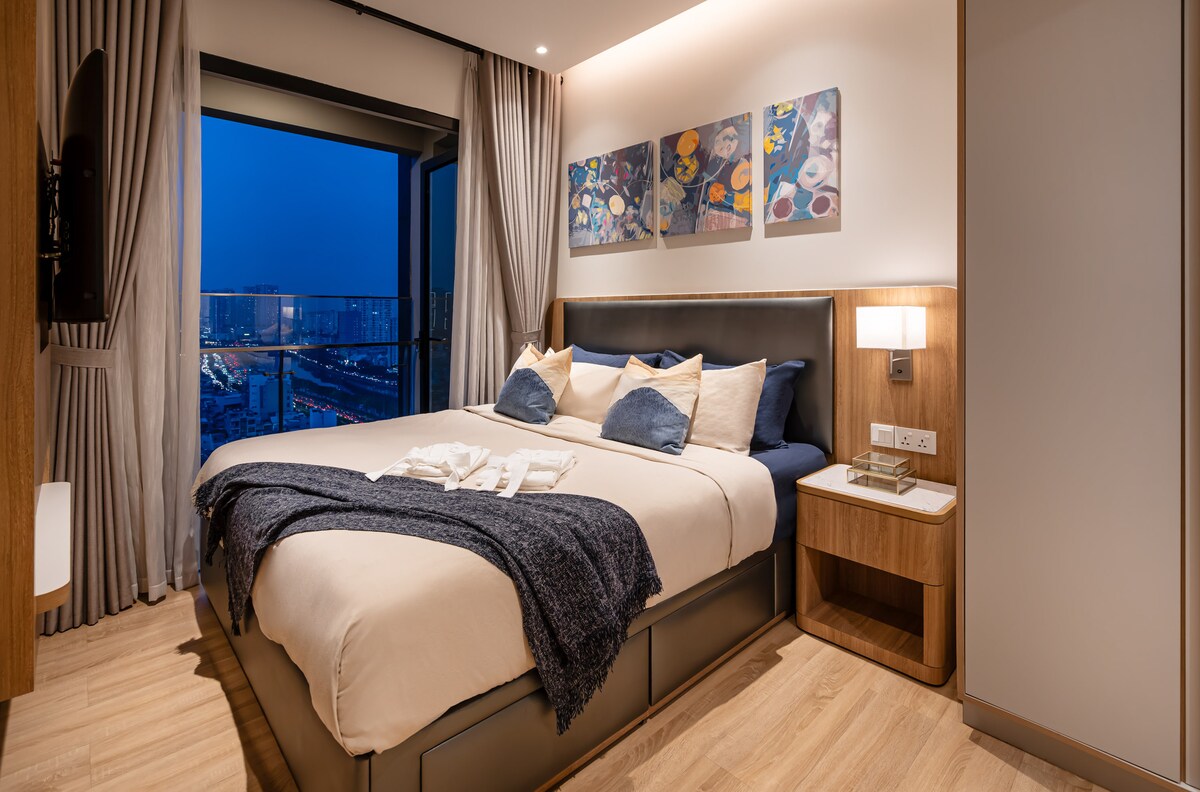 Moderno apartamento de 2 dormitorios con vistas increíbles al río para personas, familias o grupos. A 50 metros, se puede ir andando fácilmente al cine Lotte en TNL Plaza, a Starbucks, al supermercado, etc. Ofrecemos un excelente servicio con todo lo necesario para tu viaje, como: - A 5 minutos de los distritos 1, 2, 3, 5, 7 y 8. - 2 dormitorios con 2 baños. - Cocina totalmente equipada. - 3 aire acondicionados. - Lavadora y nevera, hervidor de agua rápido. - Wifi y TV de pantalla plana TCL de 43 pulgadas. - Champú, toallas, secador de pelo, etc.