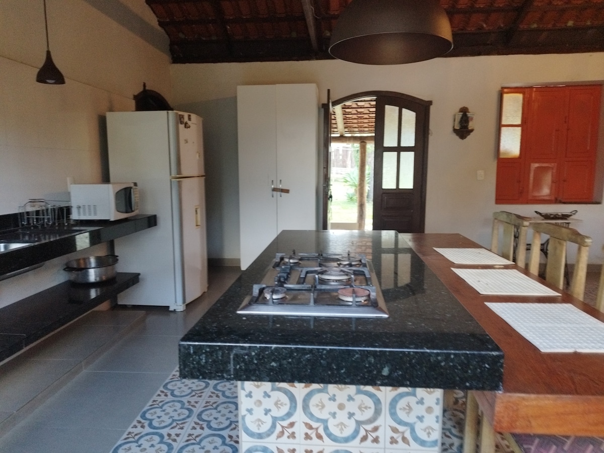 Amplia casa con 3 dormitorios, sala de estar, cocina interior, 4 baños en suite, piscina de 100.000 litros, cocina exterior totalmente equipada, mesa de billar, zona de hamacas, chimenea exterior, lago para pescar y practicar kayak, y canchas deportivas. Estamos a 5 minutos del centro de Divinópolis. Capacidad para 20 personas en camas.