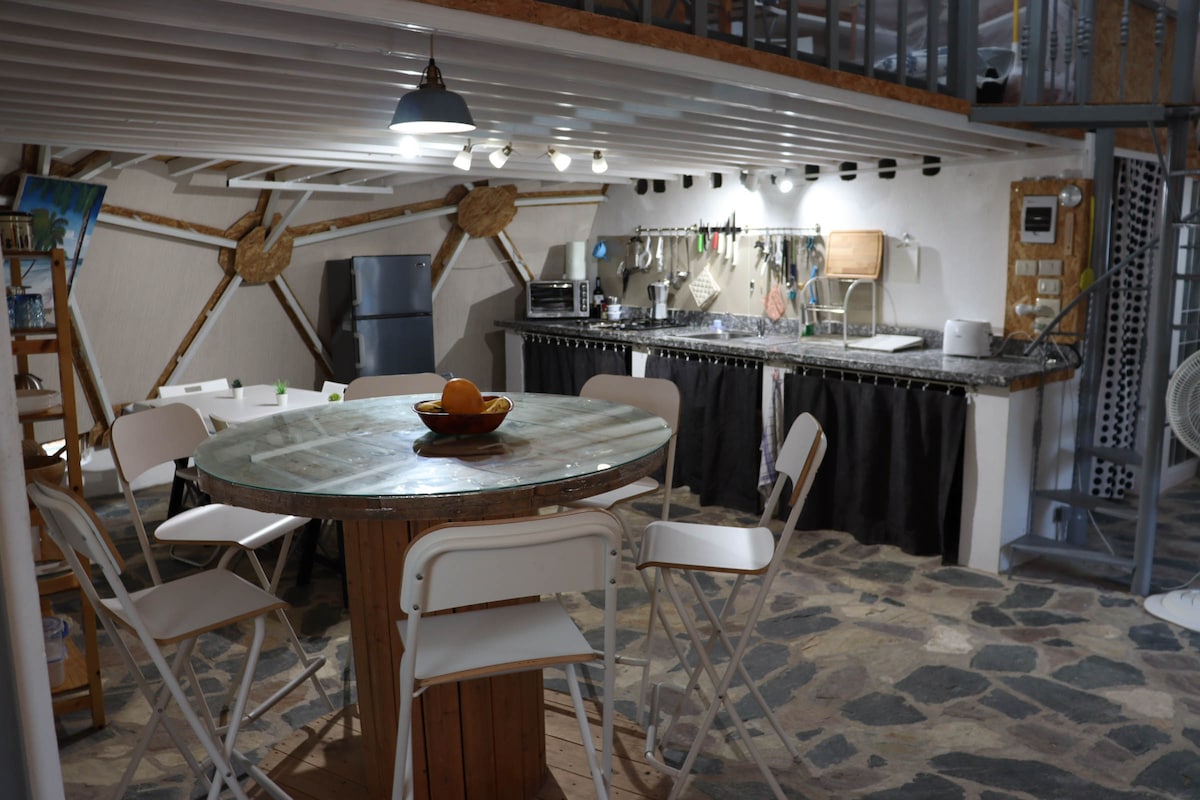 Bajo esta cúpula geodésica todo blanco se esconde un espacio de vida magnífico con capacidad para 6 personas. En la planta baja: Sala de estar con sofá cama (2 plazas), 2 sillones, mesas de salón, estantería y lámpara de pie. Cocina equipada, comedor + mesa alta (2 x 6 sillas). Cabina de ducha e inodoro-lavabo separado. Espacio de almacenamiento. En el altillo, espacio separado para dos dormitorios (1 x cama doble + 2 x cama individual). Mosquiteras y ventiladores disponibles. Video de visita disponible bajo petición