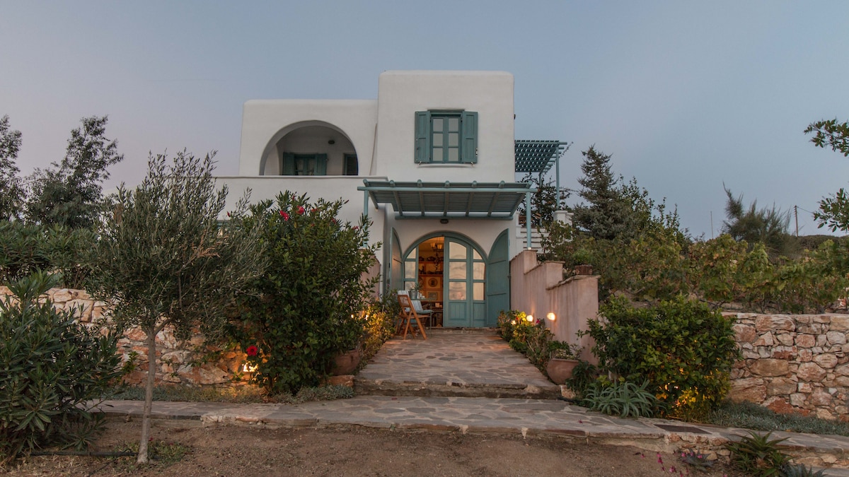 Un hermoso apartamento de estilo cicládico, dentro de un jardín, justo fuera del centro. El jardín está lleno de árboles, flores, frutas y verduras frescas. Ideal para los amantes de la naturaleza. Estás en el centro y la playa de Ag. George en 5 minutos en bicicleta, motocicleta o coche. En 12 minutos (en auto) estás en las playas de Ag. Prokopiou & Ag. Anna. Para un mejor viaje es aconsejable tener un medio de transporte. La distancia desde el centro es de 30-35 minutos a pie. Hay un espacio de estacionamiento gratuito.