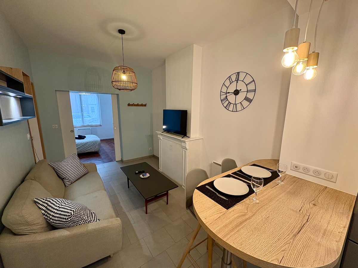 El 245 es un cómodo apartamento de 50 m², situado en el 1.º piso (acceso por escalera) en el corazón del centro de la ciudad. Tiene un gran dormitorio con una cama de 160/200 cm. Recientemente renovado, cuidadosamente mantenido y limpiado con atención, ofrece un alto nivel de confort (doble acristalamiento, equipamiento de calidad). Estacionamiento gratuito en Place du Barlet a 2 minutos a pie o en la calle (de pago de 9:00 a 19:00). Tiendas, restaurantes en las inmediaciones, estación de tren a pie en menos de 10 minutos.