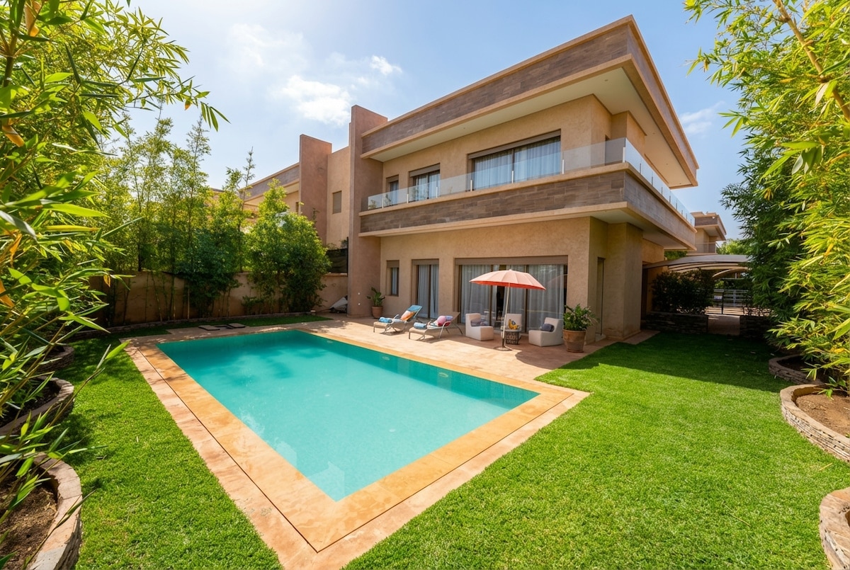 ✨Villa Inès: Elegancia pura✨ 💎 ¡Desayuno GRATIS cada mañana! 🏊 Piscina Climatizada (7x4m) en un jardín paisajístico. 🏸 Voleibol, Bádminton y Ping Pong. 🏡 Urbanización segura 24/7, 15 min del centro y 5 min del Golf. 👩🍳 Gobernata y Chef privado para sus platos a medida. 🛏 4 Suites King de lujo, TVs con Netflix, IPTV. 🚿 Duchas italianas, toallas premium y secador. 👶 Kit de bebé completo (Cuna, cochecito, trona). ✨El arte de vivir en Marrakech.✨¡Envíanos un mensaje!