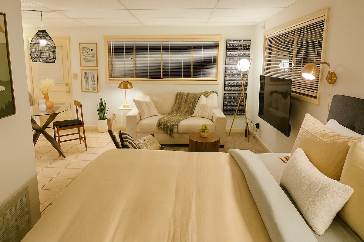 **¡TU SEGURIDAD Y TU EXPERIENCIA DE 5 ESTRELLAS COMO HUÉSPED SON NUESTRA MÁXIMA PRIORIDAD!** ¡Te damos la bienvenida a la suite Mass Street! - Ubicada en Mass St. - Suite n.º 3, 600 pies cuadrados. - Cama tamaño king muy cómoda. - Moderna y muy bien actualizada. - Diseño abierto cómodo y acogedor. - Aparcamiento seguro en el lugar. - A 3-5 minutos en coche del centro de Lawrence, Allen Fieldhouse, Universidad de Kansas, Universidad de Haskell. - Cocina equipada básica. - TV inteligente con Netflix, Disney+, ESPN+ y más. - No se admiten mascotas. - ¡Consulta también la disponibilidad de nuestra suite Junior!