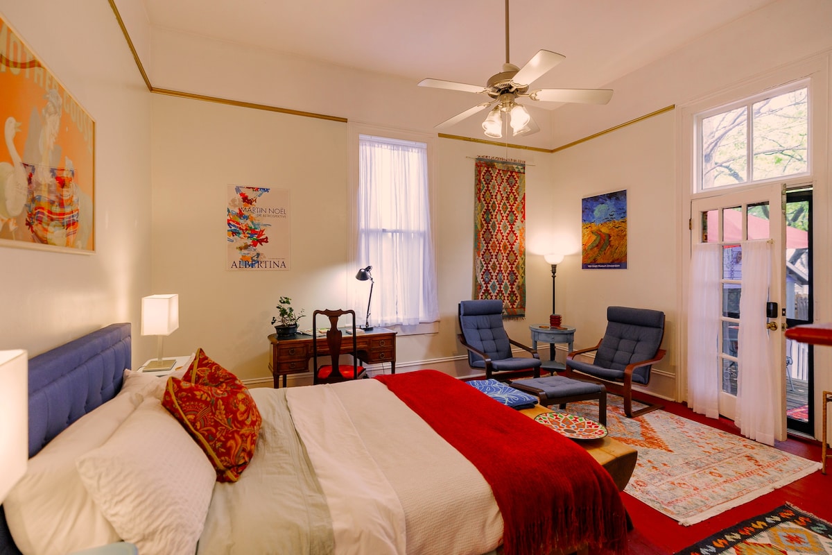 Arts & Athletics es una galería de arte en funcionamiento que hace que las obras de artistas locales y regionales sean accesibles para cualquier persona que se hospede en esta nueva incorporación a una casa de campo moderna de mediados de siglo. El nombre proviene de la base de la estatua de Atenea en el centro de Atenas. La decoración hace referencia a la diosa y a sus atributos con una versión sureña actualizada del encanto europeo de la vieja escuela. A pocos pasos de los bares y restaurantes de Normaltown o del centro de la ciudad, en el límite entre los barrios históricos de Cobbham y Normaltown.