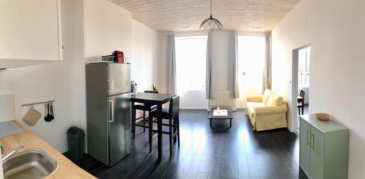 ¡Tranquilo! "Le Logis Bellevue" ha sido amueblado en nuestra casa típica de Saint-Emilionnaise con una entrada independiente por una escalera! una terraza privada con vistas panorámicas de la ciudad, los monumentos, el valle de la Dordoña, los castillos y los prestigiosos viñedos. A 15' de Libourne, 30' de Burdeos y 1h30' de la Costa Atlántica. A 2 pasos de comercios de proximidad, restaurantes, animaciones y estacionamientos públicos. Es adecuado para todo tipo de viajeros (turismo/negocios)