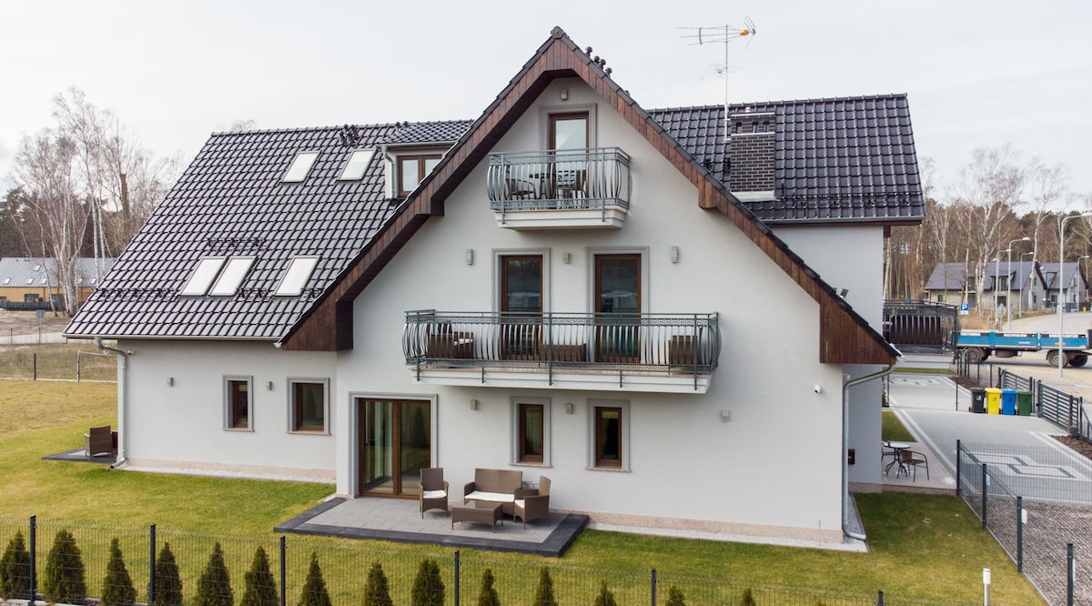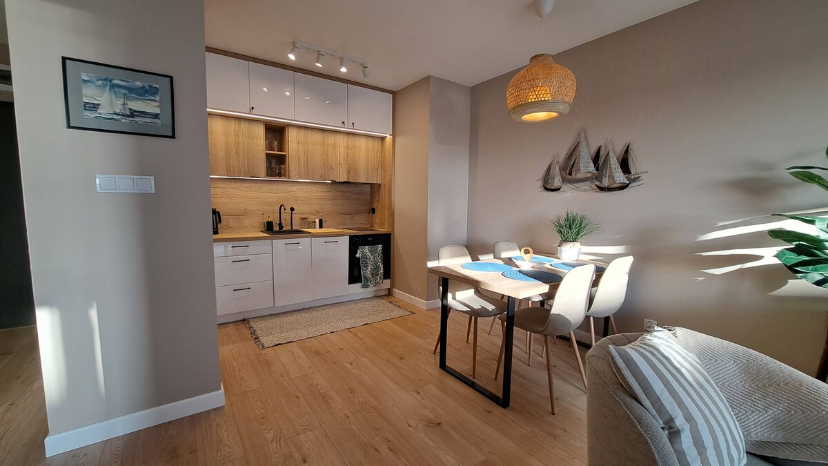 Vistas directas al agua: acogedor apartamento de estilo retro con amplio balcón, a 600 metros de la playa y del centro. Ropa de cama, toallas y limpieza final incluidas en el precio total. Perfecto para familias. Piscina cubierta y sauna en la casa. Dos bicicletas de senderismo gratuitas incluidas. El impuesto turístico de 3 PLN por huésped y noche se paga en el sitio.