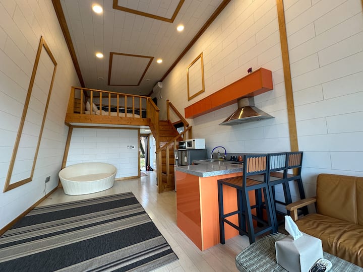 Jardín privado/bañera al aire libre con agua caliente gratuita/sala de comedor de altura y cocina blanca en un piso elevado