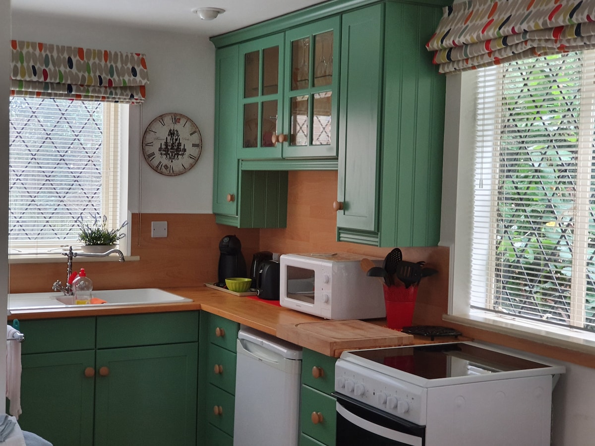 Estamos en una zona de gran belleza natural. Hay una zona de terraza alrededor de la cabina con una fogata más mesa y sillas para cenar al aire libre o simplemente disfrutar del aire fresco. Estamos rodeados de campos ubicados a aproximadamente 1 milla del pueblo y los pubs. Puedes salir a dar un paseo por el condado desde el escalón de la puerta. Varias propiedades de fideicomiso nacional en el área. A partir de mayo de 2025, ampliamos el camino en auto para facilitar el estacionamiento. Los huéspedes tienen espacio para estacionar un auto en la calzada.