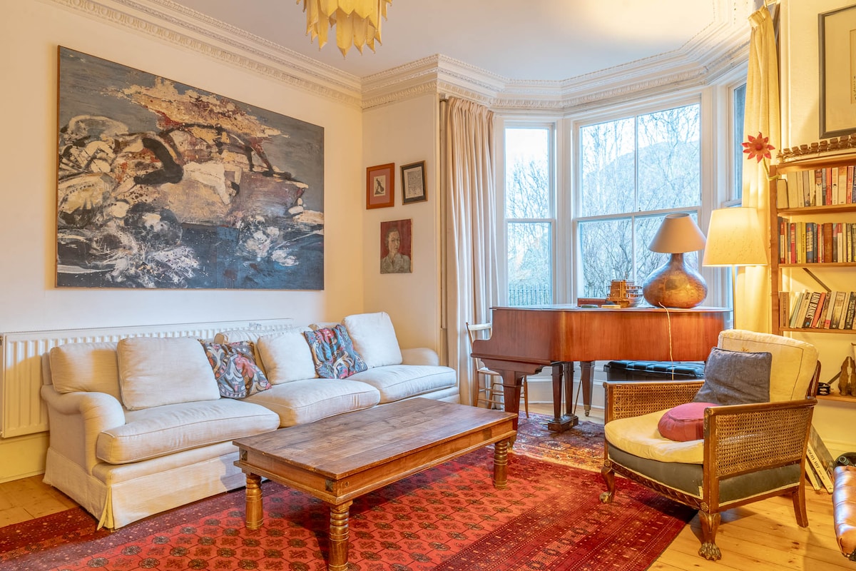 Una casa familiar con una colección de arte seleccionada, alfombras persas y muebles de todo el mundo. Situada a 10 minutos a pie de los recintos del festival, la Universidad de Edimburgo y el centro de la ciudad, la casa conserva una sensación de tranquilidad campestre. La puerta principal se abre a un camino hacia Arthur's Seat y la puerta trasera a un aislado jardín orientado al sur, con asientos y chimenea para las noches frías. Tenemos un exuberante jardín con una espiral de hierbas para ensaladas y cocinar, y tiendas, panadería y restaurantes a poca distancia a pie.