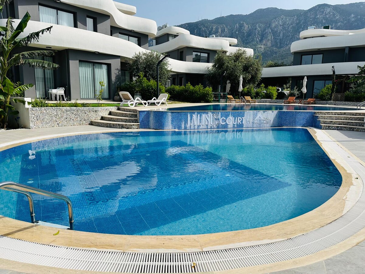Un complejo boutique decente,tranquilo y tipo villa situado justo detrás de Alsancak Walking Park y donde puedes bajar escaleras de 6 escalones hasta la piscina desde la terraza de la sala de estar. A solo 300 metros de la famosa Escape Beach. Está bellamente ubicado en medio de Merit Royal y Cristal Cove Hotels en Alsancak y el Kaya Palazzo Hotel en Karaoğlanoğlu en la otra dirección. Incluso si no alquilas un vehículo, el minibús está a 250 metros de la calle que pasa. Apto para hasta 5 personas en total Un alojamiento donde te convertirás en habitual
