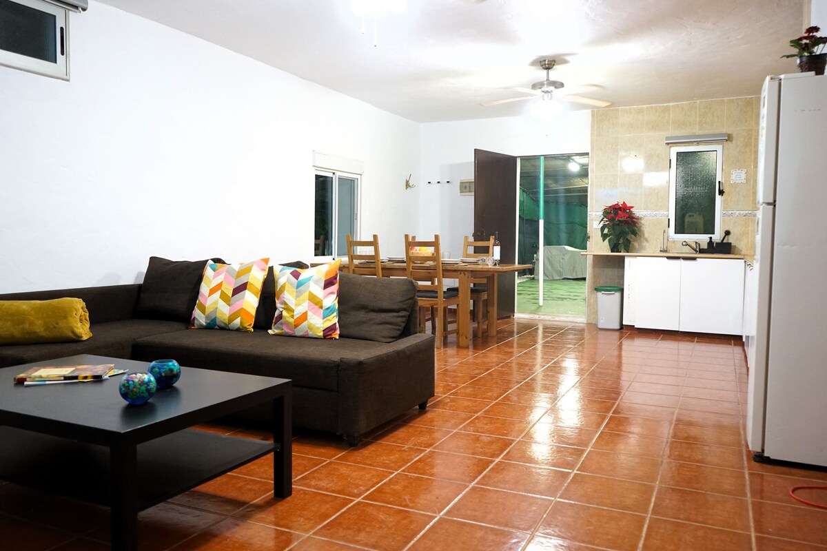 La Finca está situada aislada en la montaña, distancia de la playa 8 km, pueblo 2 km. La bajada de 350m es de tierra y podria ser dificil para algunos conductores, pero se puede dejar el coche arriba y nosotros transportamos el equipaje. Disfruten de la naturaleza y la tranquilidad! Tenemos muchos frutales y aromaticos, todo ecologico y producimos la corriente con sol y viento.
