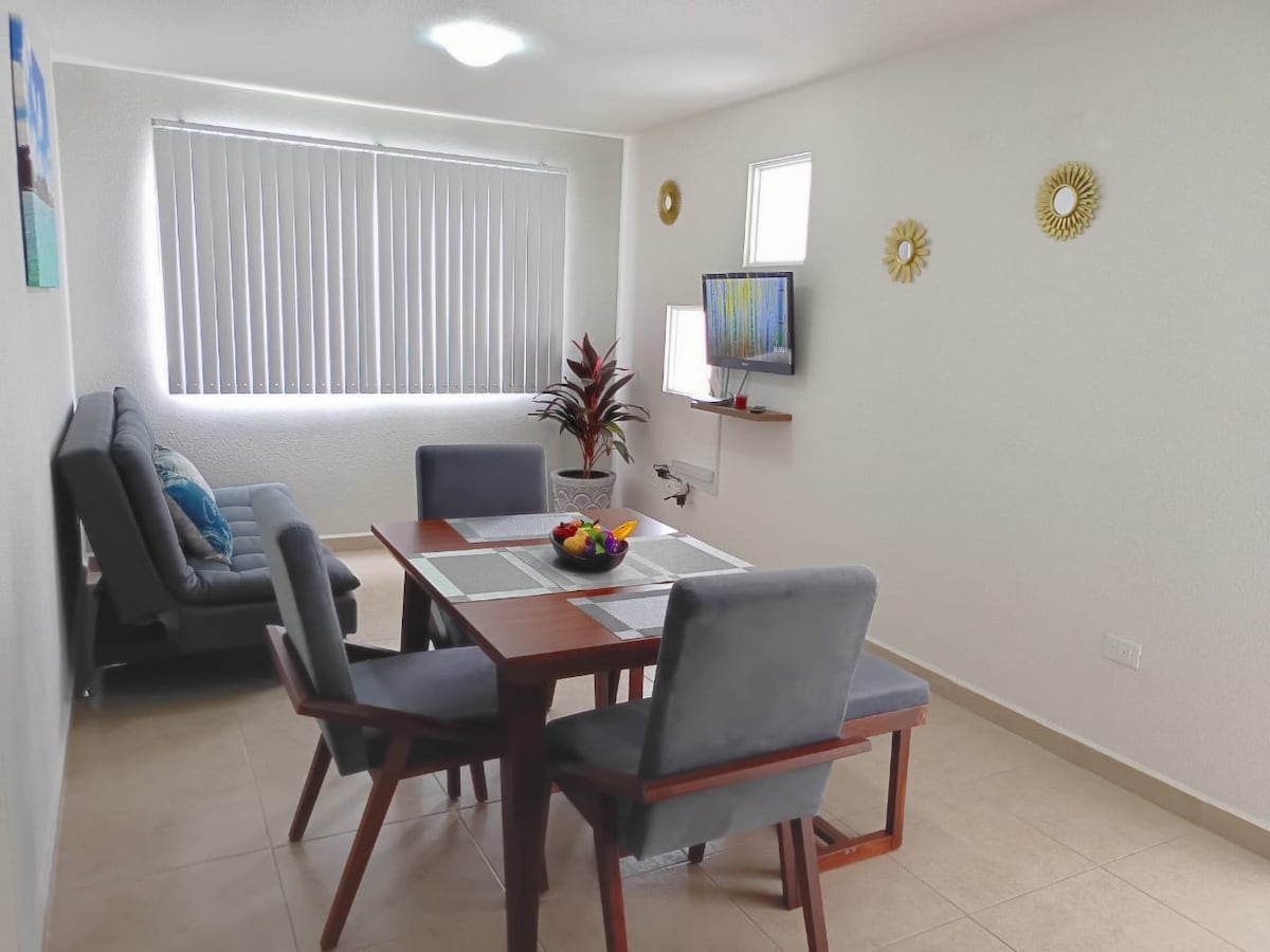 Disfruta de este bonito departamento para 4 personas en un condominio con alberca, gimnasio, cancha de pádel, pista de jogging, área de juegos para niños y estacionamiento privado para 2 vehículos. Ideal para escaparte de fin de semana o para estancias medianas donde hacer Home Office. Wi-Fi, Netflix, agua purificada y lavadora/secadora incluídos. No te faltará nada durante tu estancia.