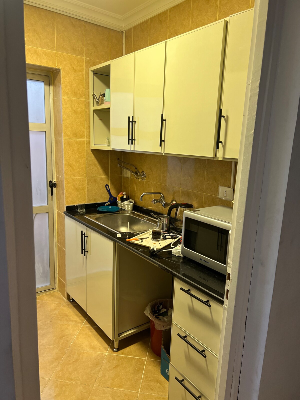 🌟 Lo que ofrece este lugar • 🛏 Capacidad para 4 personas (cama cómoda + sofá cama). • ❄️ Totalmente climatizado con electrodomésticos nuevos. • Internet de alta velocidad de fibra💻 óptica, perfecto para trabajar y transmitir. • Cocina🍳 totalmente equipada con mesa de bar elegante. • Televisor inteligente de📺 50 pulgadas en una acogedora sala de estar. • 🚗 A solo 4 minutos de Suez Road, fácil acceso a la ciudad. • Barrio🏡 tranquilo y agradable.
