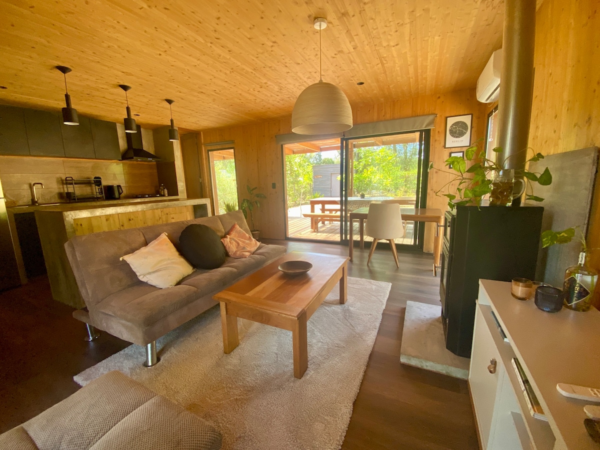 Cálido y encantador bungalow de madera con techo de quincha, ubicado a pocas cuadras del centro de Manantiales y de la playa Bikini, una de las más hermosas de la zona. Ideal para parejas que buscan privacidad, calma y un entorno natural con estilo, la cabaña está equipada con todo lo necesario para disfrutar tanto del verano como del resto del año. Su diseño térmico y excelente aislamiento garantizan confort en todas las estaciones.