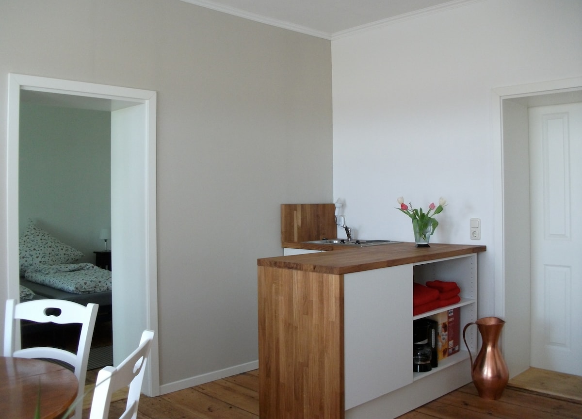 «Vivir entre muros antiguos como en los tiempos de la abuela»: apartamento de vacaciones en la casa protegida de doble sala con cocina, pequeño baño con inodoro y ducha, una habitación con dos camas individuales, una habitación de paso con cama doble y otra pequeña habitación con cama doble y cuna. Disfrute del ambiente de nuestro patio delantero y de la extensa zona ajardinada de 6000 m² con estanque, huerta, escalera de los sentidos, animales y mucho más.