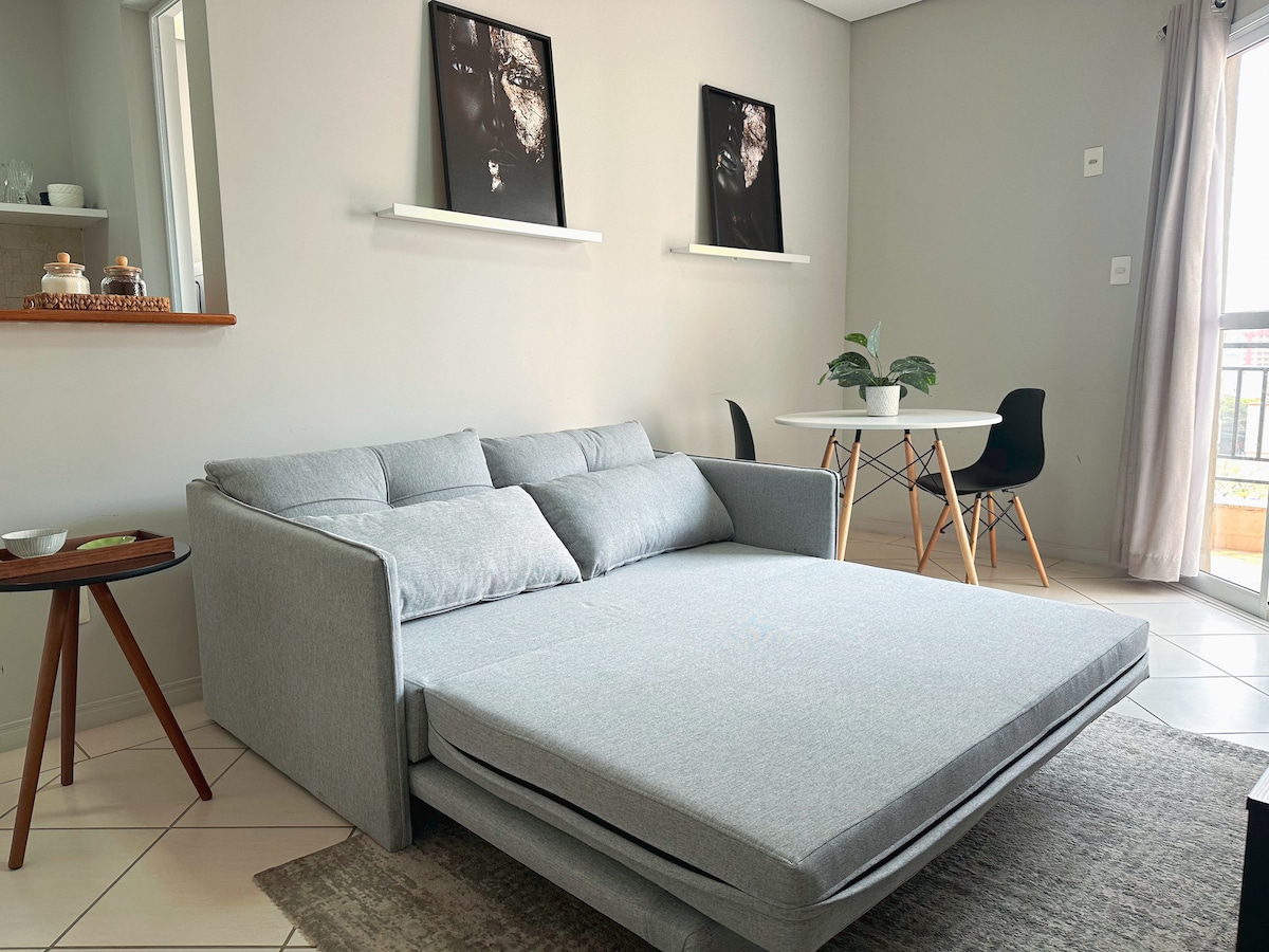 Apê moderno com ar-condicionado, varanda, cozinha completa e decoração de design. A 10 min do Cambuí, 15 min do Aeroporto de Viracopos, 6 min da Rodoviária e 5 min do Campinas Shopping. A uma quadra da Av. Amoreiras e do Parque Villa Garden, com supermercados, Oba, McDonald's, padarias, BRT, restaurantes e muito mais ao redor. Prédio com piscina, academia, rooftop, mini mercado 24h e academia Panobianco. Perto de tudo!