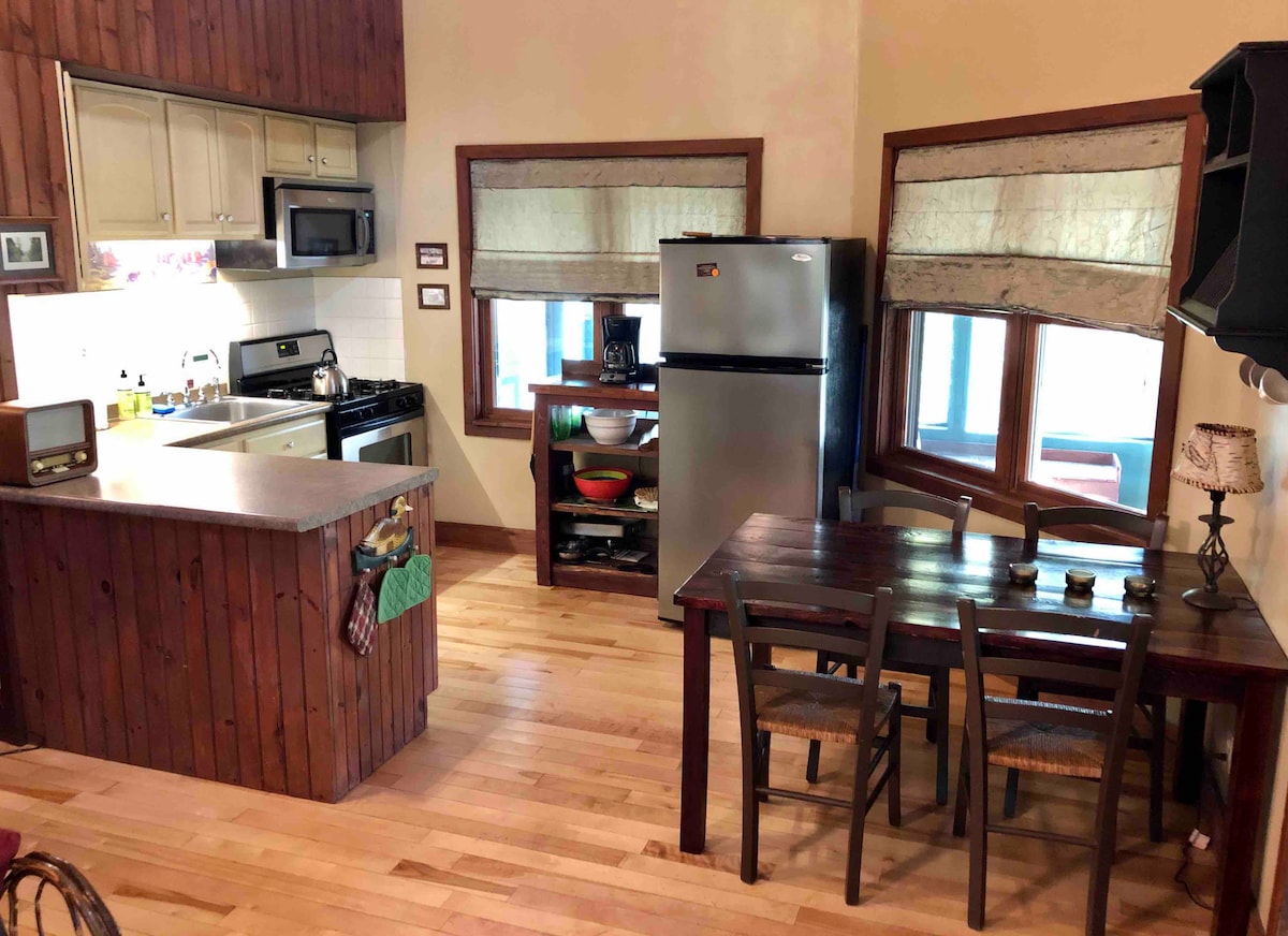 Nuestra suite con entrada independiente se encuentra en nuestra pequeña granja de caballos en las estribaciones de las montañas Adirondacks. El espacio tiene un encanto rústico acogedor y cuenta con todo lo necesario para una escapada tranquila a la montaña en cualquier época del año. Estamos ubicados justo en la entrada de Blueberry Hill Trails, un sistema de senderos de 1000 acres diseñado para practicar senderismo, raquetas de nieve, esquí, ciclismo de montaña y paseos a caballo. Sal por la puerta y estarás justo en los senderos.