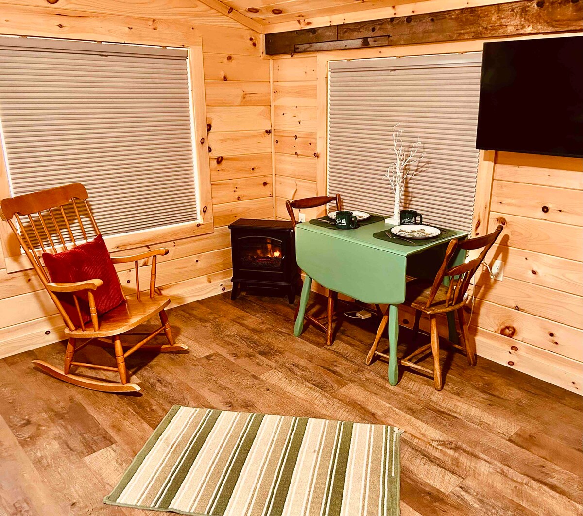 ¡Sin cargos adicionales! Despiértate con los sonidos y las vistas de un relajante arroyo de Adirondack en la pintoresca y pequeña Elizabethtown, Nueva York. El edificio está en nuestro patio trasero y el interior mide aproximadamente 10x12, con una cama tamaño queen, cómoda, mininevera, cafetera, enchufes, luz dentro y en el porche abierto, TV y calefacción/ventilador. Disfruta del café del desayuno o lee un libro junto al fuego. Por favor, trae tus propias sábanas para la cama tamaño queen y toallas. Se proporcionan mantas para uso en el interior. La ducha/inodoro son compartidos.
