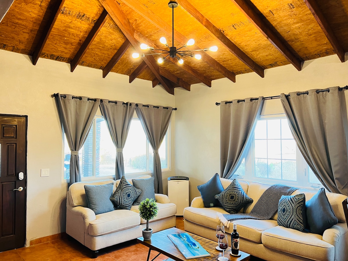 Disfrute de las vistas de los viñedos y el valle de la montaña mientras captura el amanecer en el atrio y la puesta de sol en el patio. Esta casa estaba pensada para el entretenimiento, tanto en el interior como en el exterior, con espacio para hasta 6 personas cómodamente. Ubicado en el corazón del valle con fácil acceso desde Rte 3. Estamos a 5-15 minutos de varias bodegas y de restaurantes con estrellas Michelin y Top 50 de América Latina. La Arena Valle de Guadalupe está a 20 minutos.