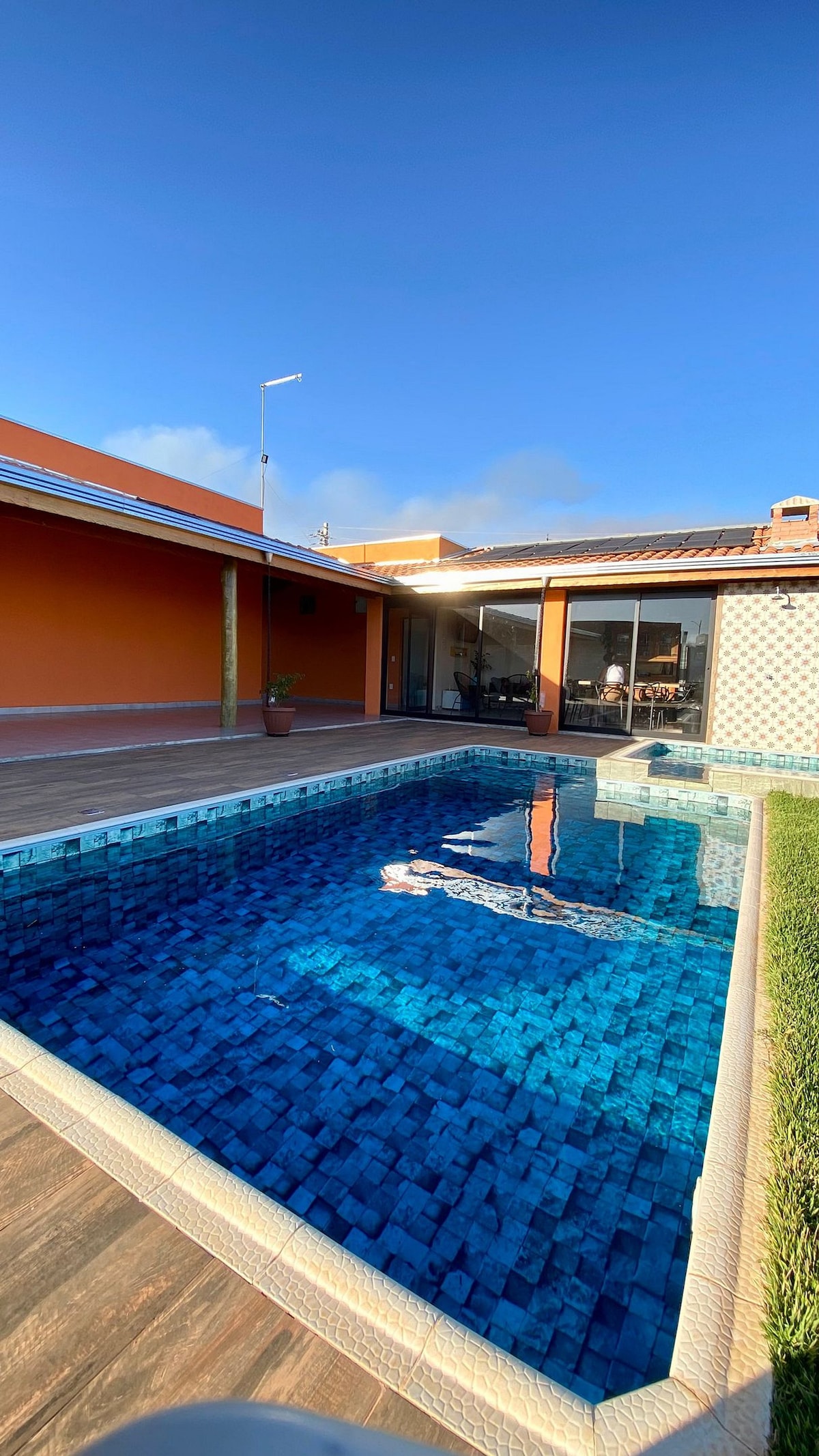 La granja cuenta con piscina y barbacoa, mesa de billar, campo, sala con TV, cocina completa interna, cocina externa con estufa industrial, 3 dormitorios y una suite, todos con aire acondicionado, dormitorio externo con ventilador, wi-fi, amplio balcón con hamaca. Tiene capacidad para 13 personas. Ideal para reuniones familiares. Aparcamiento para varios coches.