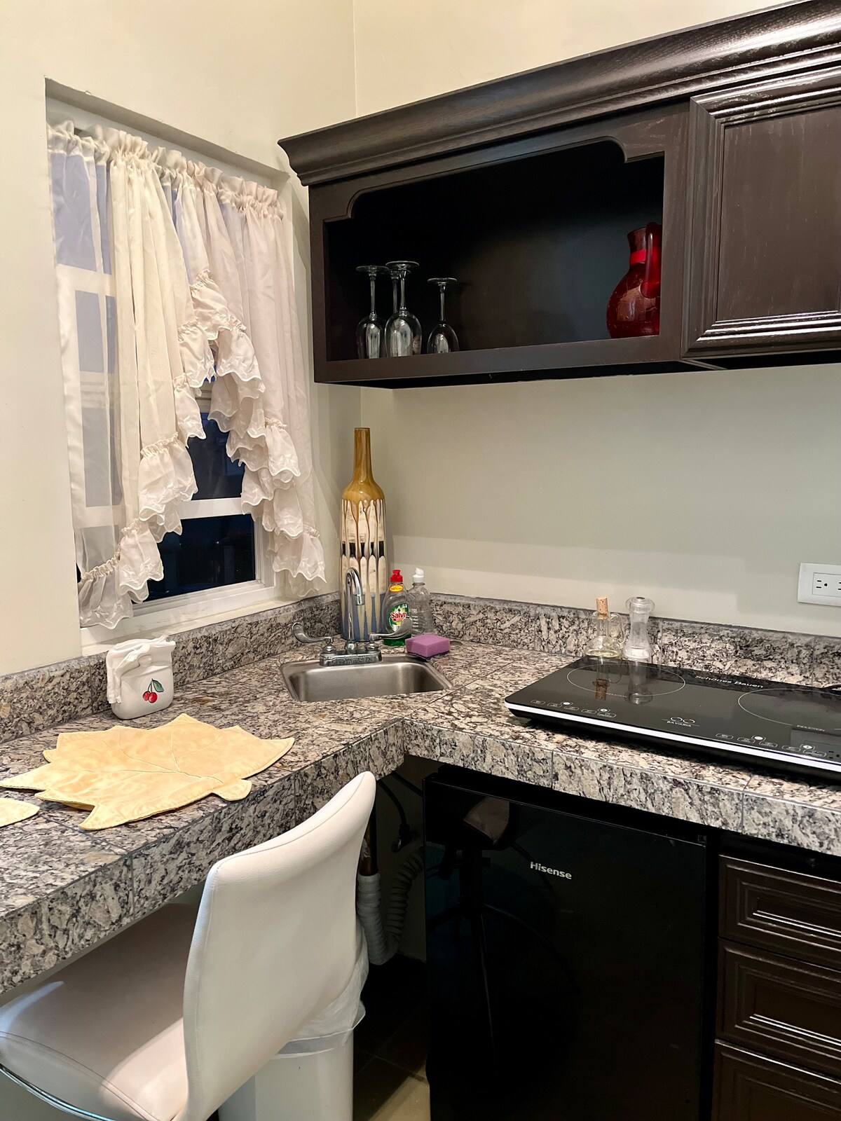 Cuarto estudio pequeño con baño, independiente, muy cómodo, cama Queen, para persona sola o pareja, no apto para bebés o niños pequeños hay cristalería a la mano. Muy limpio, sanitizado a profundidad. Alejado de la calle, cerca del centro. TV con cable, internet, Con frigobar, micro y cafetera, ideal para descansar y/o trabajar, secadora de cabello y plancha. Se ubica fuera del área de la casa principal con entrada independiente, porche de entrada, completamente privado y muy seguro.