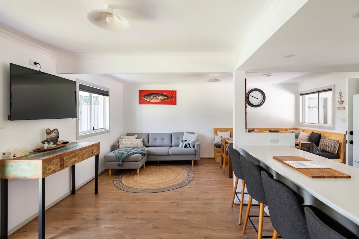 Kenny es una casa de estilo años 70 recientemente renovada con un enorme patio trasero a solo unos minutos a pie de las tranquilas aguas de Erowal Bay y a poca distancia en auto de las arenas blancas de Hyams Beach, Jervis Bay. Kenny está lleno de encanto, carácter, espacio, luz y buenas vibras. Desde los inicios de los años 70 hasta la nueva comodidad de los acabados modernos y todos los servicios que necesitas para unas vacaciones en la playa. Con un fogón y acceso para huéspedes a kayaks y bicicletas, Kenny es la joya que has estado esperando y de la que todos nuestros huéspedes se enamoran.