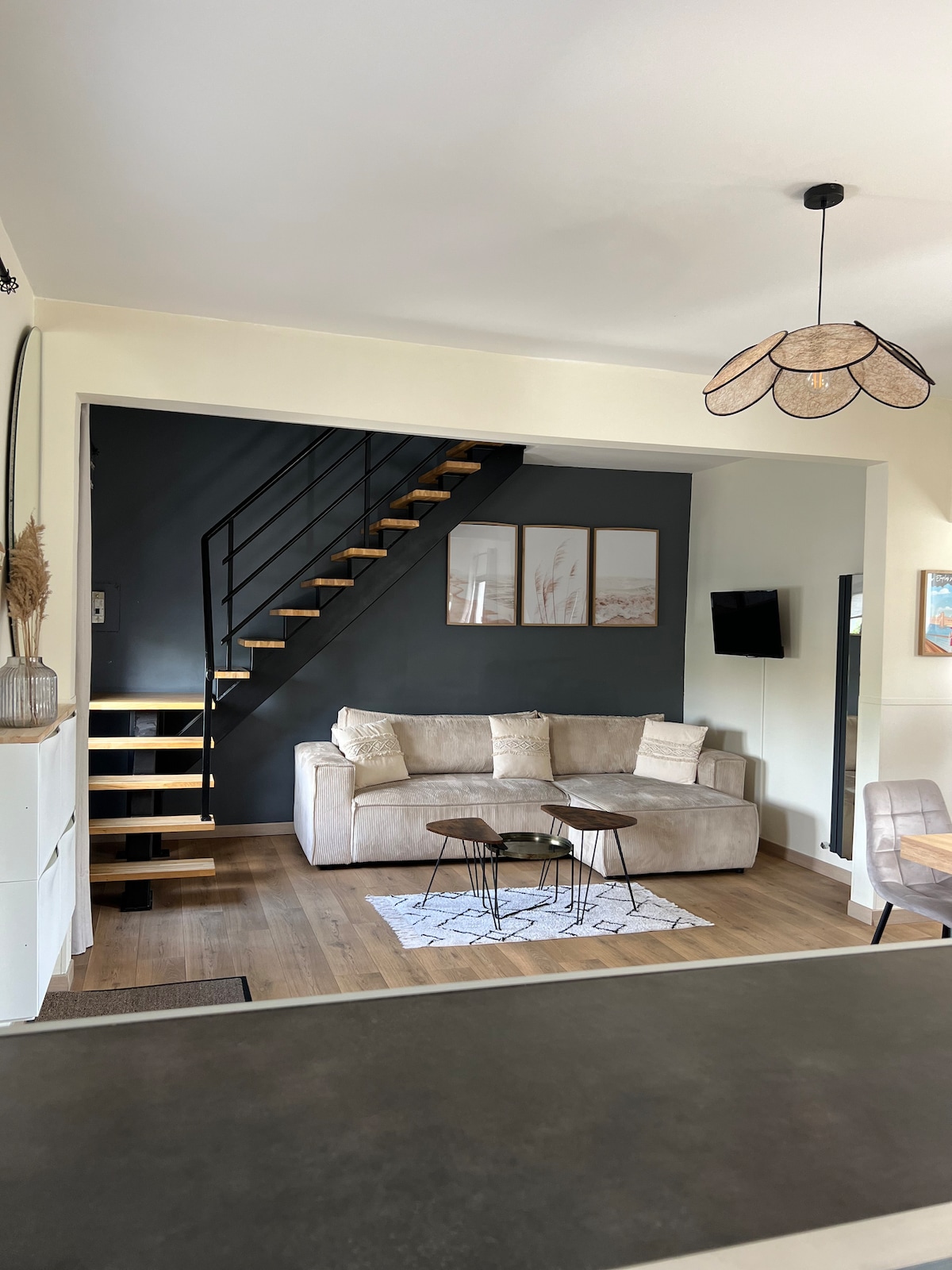 Olvídese de sus preocupaciones en este alojamiento espacioso y sereno. Bonita casa con decoración de estilo industrial. En la planta baja, descubrirá una hermosa sala de estar, un comedor, una cocina equipada, un baño con ducha, WC separado, una hermosa habitación con TV. Arriba encontrará un dormitorio grande con TV y un baño con inodoro. Wifi; Dispondrá de una plaza de aparcamiento privado en frente de la casa y un patio y un jardín cerrado en la parte posterior de la vivienda