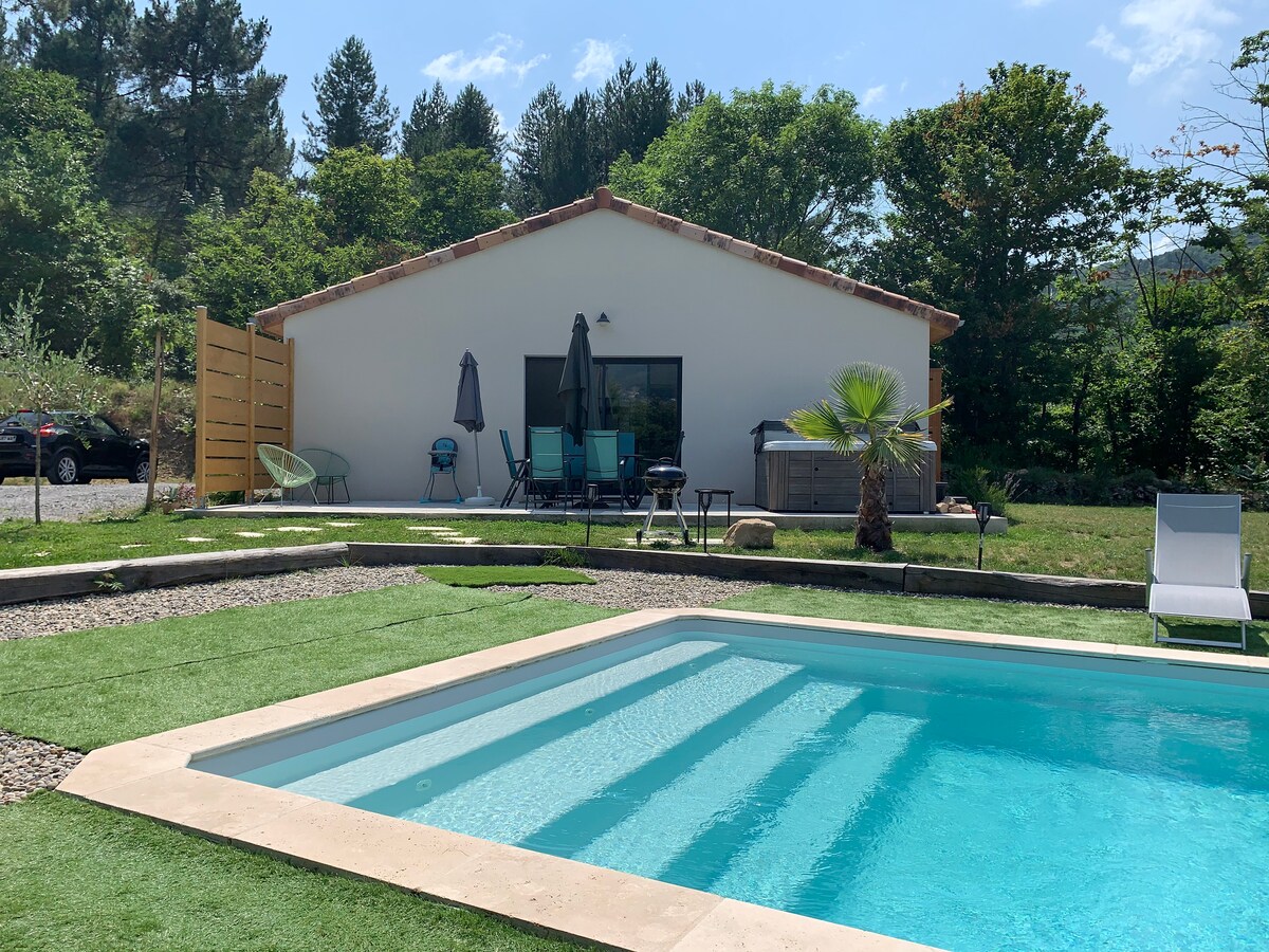 Venga a relajarse en Ardèche en esta agradable casa 4*, independiente,con SPA totalmente privado , climatizado ,en funcionamiento durante todo el año . ¡piscina PRIVADA abierta de mayo a octubre (no climatizada) con vistas a los Montes de Ardèche! Comodidad y descanso asegurados entre el spa y la piscina ... Río cercano; Ardèche y Lignon . Situada entre Pt de Labeaume y el encantador pueblo de Jaujac, en un terreno de 800 m2, con hermosas vistas, vegetación . Desde hermosos paseos y visitas a sitios naturales.