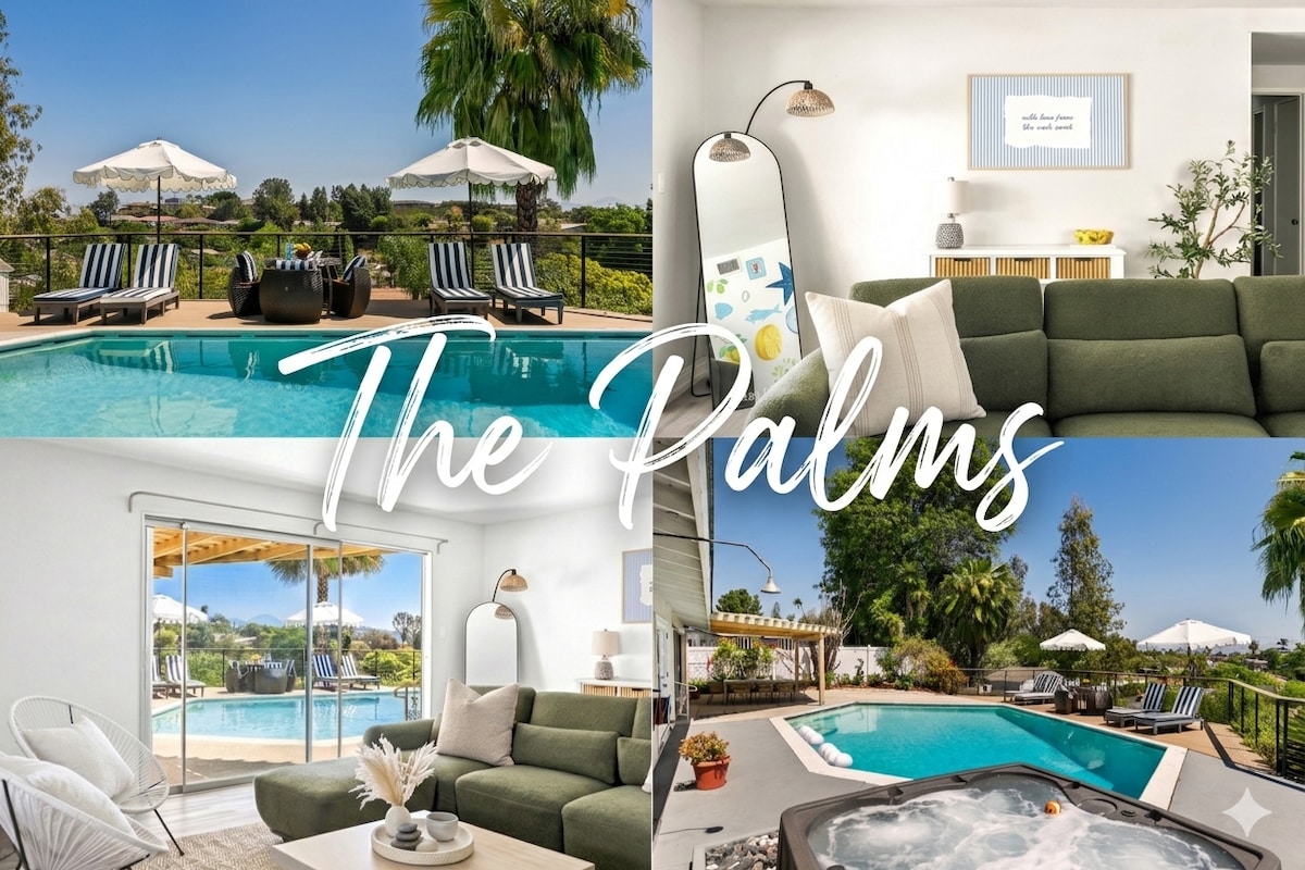 Norte de San Diego, ecológico, perfecto para escapadas familiares o reuniones íntimas, cenas, bodas pequeñas. 3 amplios dormitorios en suite abiertos a la impresionante área de la piscina privada y el paisaje que rodea la villa. Relájate junto a la piscina climatizada con energía solar y al spa climatizado con propano. Crea una comida inspirada en la gran cocina abierta con electrodomésticos Viking.