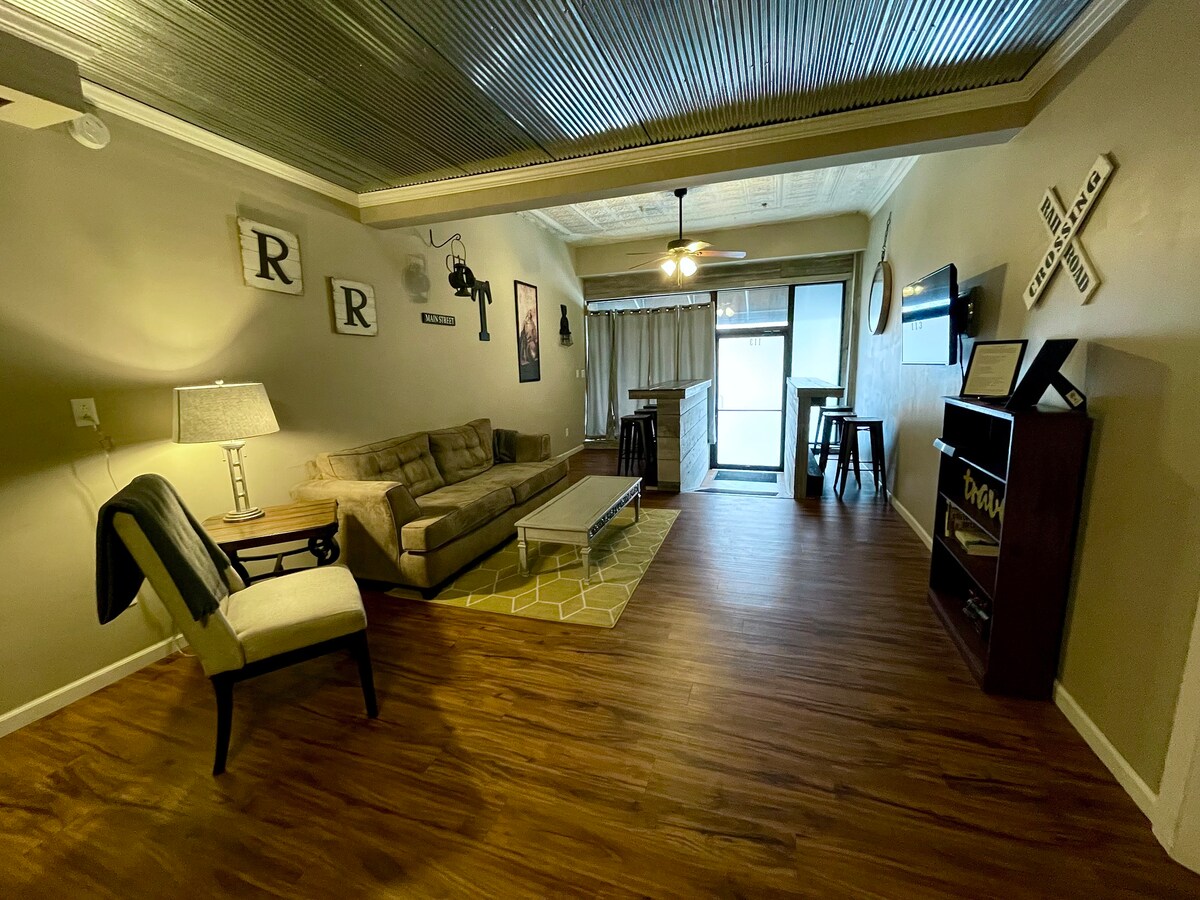Bienvenido a nuestra espaciosa suite King, un refugio privado cuidadosamente diseñado, perfecto para parejas, viajeros solitarios o estancias prolongadas. Esta suite de hermoso estilo combina encanto histórico con comodidad moderna, con una lujosa cama tamaño king, una acogedora chimenea, una cocina completa y una acogedora sala de estar. Ya sea que estés de visita para una escapada de fin de semana o para una estancia más larga, este espacio está diseñado para sentirse tranquilo, cómodo y habitable sin esfuerzo.