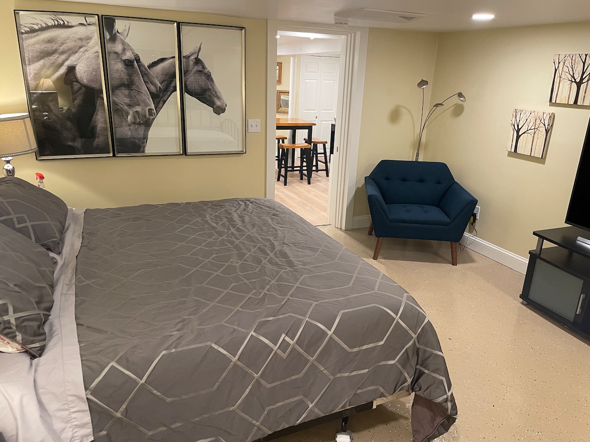 Estudio eficiente, luminoso y semisótano con gran entrada de puerta francesa que da al patio delantero. Incluye una cama tamaño queen a estrenar, un baño completo con ducha, un armario grande, una sala de estar y una cocina bien equipada con mesa de comedor. Wifi y un monitor ROKU. No hay servicio de cable. Ubicación tranquila e ideal en el bosque, cerca de tiendas, restaurante, playa y carril bici. Plaza de aparcamiento justo en la puerta principal. ¡No se admiten mascotas!