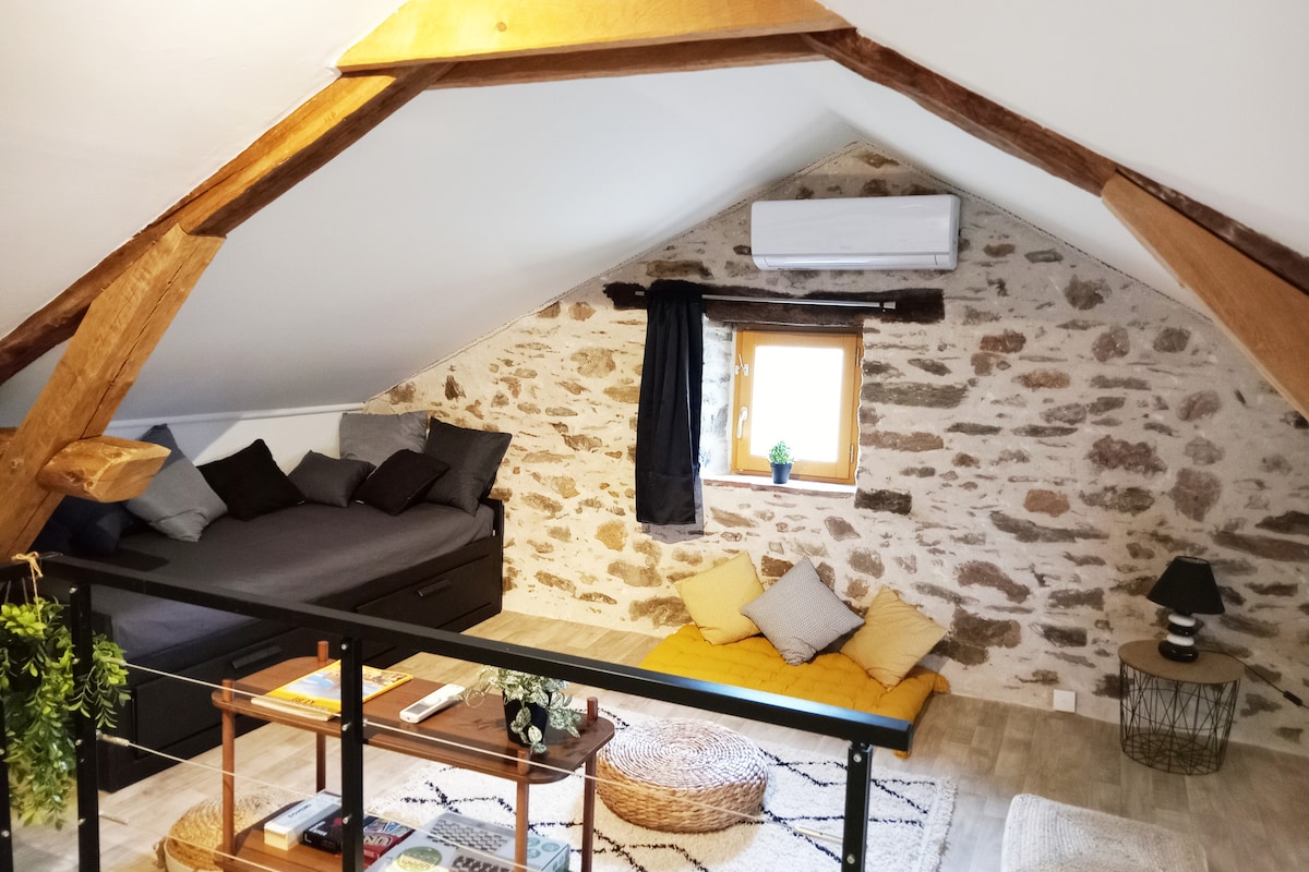 Grange indépendante , rénovée avec soin, à 30 m de notre maison. Suite de plain-pied, fermant à clef avec: - entrée séparée - l'air conditionné - salon avec canapé-lit (140) et TV 140 chaines, Canal+ , Prime vidéo - Nespresso, bouilloire, mini frigo. Snacks - Côté nuit un lit 160 x 200; lit bébé - salle de bain avec douche à l'Italienne, WC séparé - bureau (fibre 1 Gb/s) - borne de recharge VE T2 7.4kw. - parc, barbecue plancha & table pique-nique. - Piscine 7 m x 3,5 m à partir de mai 2026