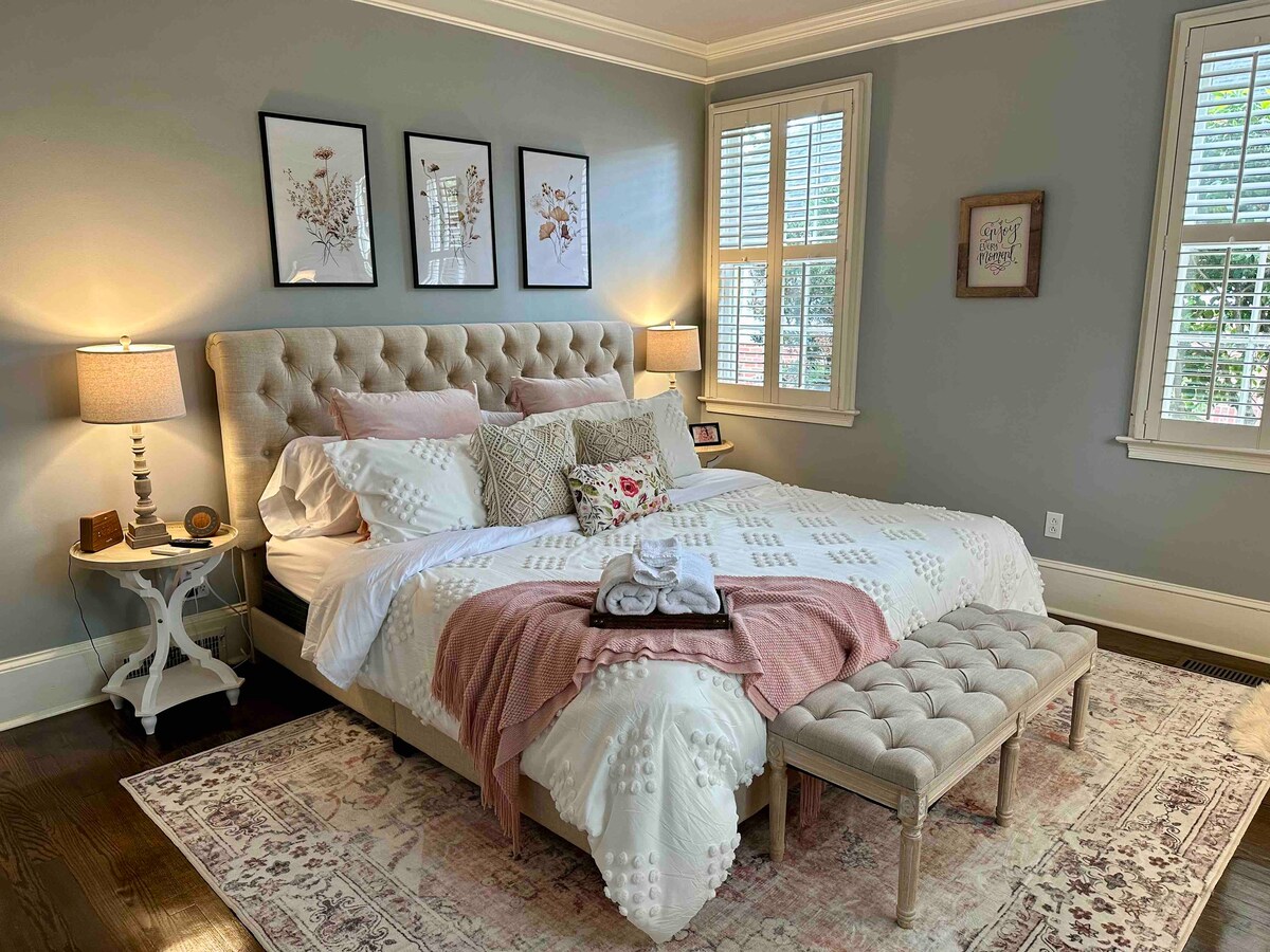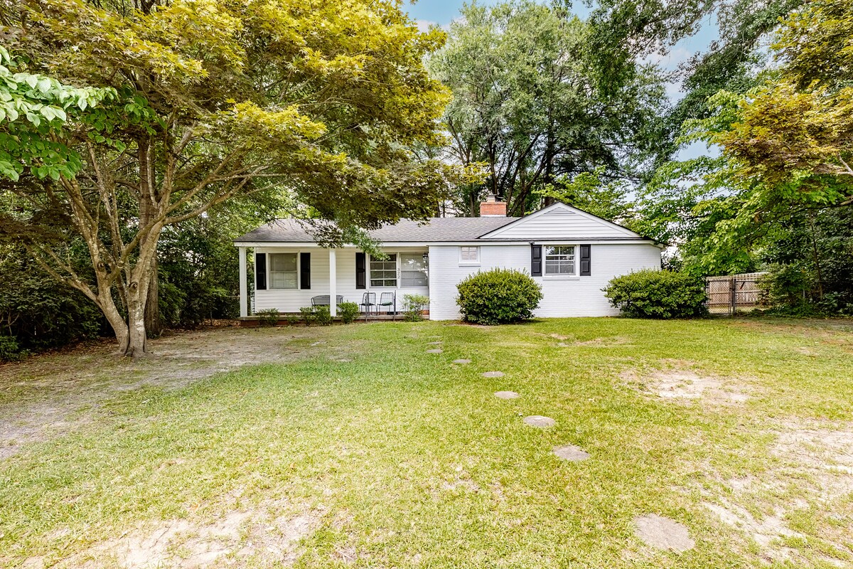 1940 Haymount histórico ~ Casa de ladrillo totalmente restaurada y bellamente amueblada en el corazón del hermoso distrito histórico de Fayetteville. Relájate con esa dulce hospitalidad sureña con un buen libro en el columpio del porche, o visita a tus amigos y familiares en el porche privado o alrededor de una acogedora fogata. Con un agradable paseo hasta el centro histórico y el distrito comercial de Haymount, amueblado con lo último en moda y tecnología para el hogar, ¡seguro que te encantará el desayuno en Tiffany's!