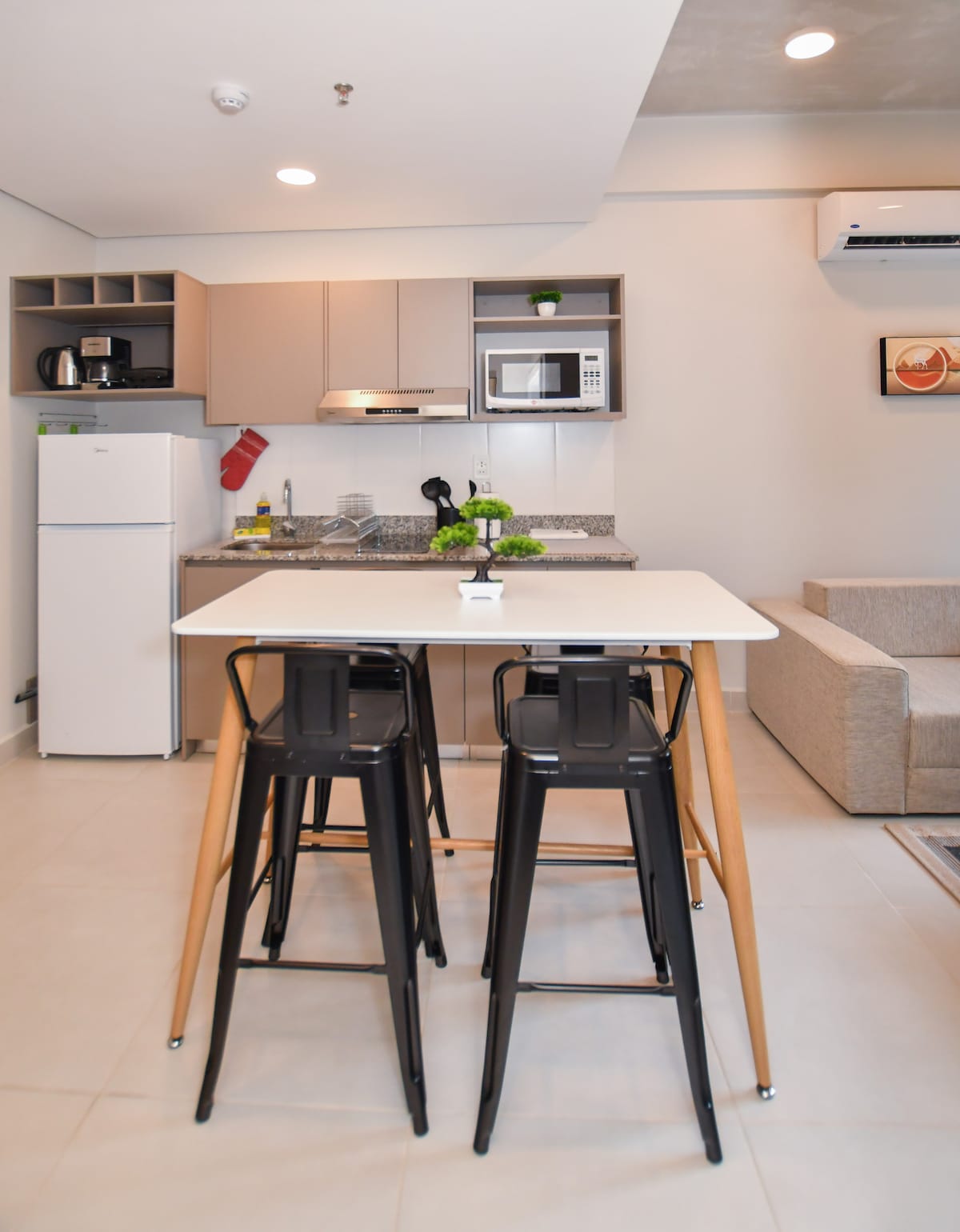 Monoambiente moderno, cómodo y con luz natural todo el día. Tiene balcón con vista abierta, ideal para relajarse o trabajar. Está bien ubicado, cerca de todo pero fuera del ruido del centro. El edificio ofrece pileta, gym, parrillero(pago), sala de reuniones con proyector y TV, salón de cartas, sala de niños con TV y área de lavado con máquinas. Equipado con aire, Wi-Fi, smart TV, cocina completa y escritorio. Ideal para estadías cortas o largas. Permite alojar hasta 3 personas.