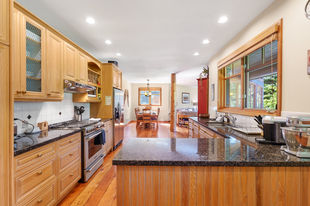 Al norte del pueblo, en un hermoso chalet orientado a la familia: ¡4 dormitorios cada uno con baño privado, l y chimeneas nuevas! La sala de estar, el comedor y la cocina son un gran espacio abovedado en la planta superior con aire acondicionado: madera dura, chimenea grande nueva, mesa de comedor larga, además de una terraza enorme que incluye sofás al aire libre, 2 sombrillas, barbacoa y comedor. Cuarto de barro independiente con calefacción y una nueva lavadora/secadora doble. Disfruta de las vistas de los esquiadores y ciclistas de Blackcomb y Whistler desde un jacuzzi privado que da a una reserva natural.