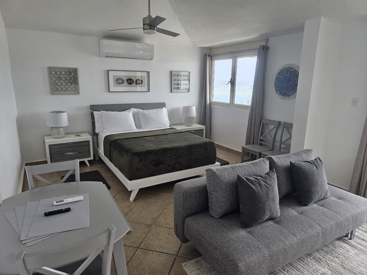 Brand new modern efficiency apartments with astonishing views to Bahía Ensenada Honda, town, Vieques and in clear days St. Croix. One of the few studio apartments with two queen beds, bay view from the shower, fans in the bathroom, kitchen and beds, powerful A/C unit, 40 inches smart tv, kitchenette, microwave, beach towels, beach chairs, snorkeling gear and a cooler. You are more than welcome to be the first couple or family to enjoy this new gem in what is call "the last US Virgin Island".
