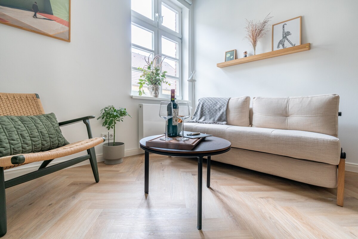 Este apartamento de 76 m2 recién reformado es un refugio estético diseñado para la tranquilidad, la conexión y la comodidad absoluta a solo 5 minutos a pie del corazón del centro de Flensburgo y el puerto. Ya sea que estés explorando la ciudad en solitario, disfrutando de una escapada romántica o creando lazos con amigos, nuestro espacio está hecho a medida para crear recuerdos inolvidables en Flensburgo. Así que reserva, sumérgete en la relajación y experimenta la esencia de Flensburgo en su máxima expresión. ¡Tu escapada perfecta te está esperando!