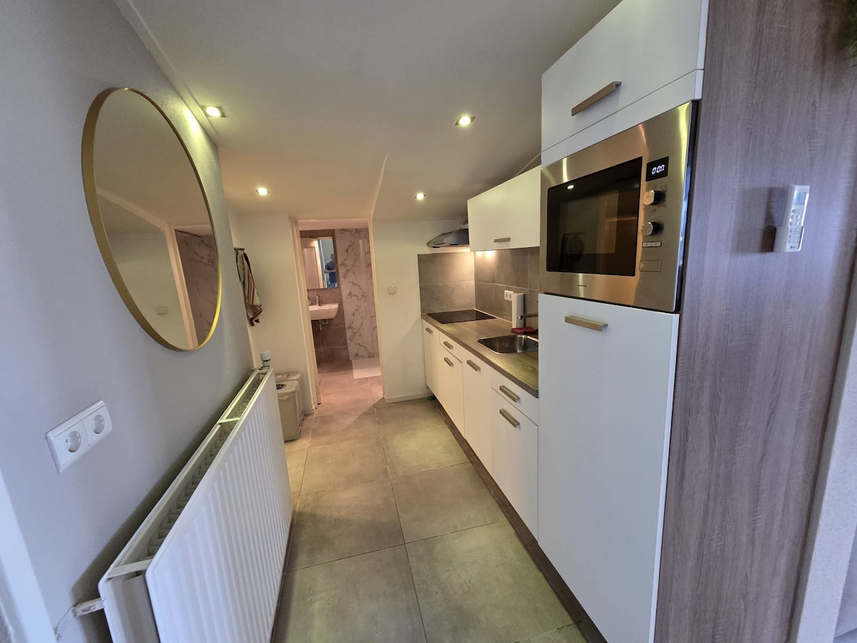 Estudio modernamente amueblado con un cómodo Boxspring tamaño king y una terraza privada soleada. Playa, bosque, parque, tiendas (Lidl, panadería, etc.) y Boulevard a poca distancia. Solo alquilamos una habitación. Así que no hay otros huéspedes. Televisión inteligente grande con Netflix, wifi rápido. Persiana enrollable y mosquiteros. Cocina: lavavajillas, placa de 4 quemadores (2021), campana extractora, horno combinado (2021), hervidor, 2 cafetera, tostadora, vajilla. El baño completamente nuevo tiene inodoro y ducha de efecto lluvia.