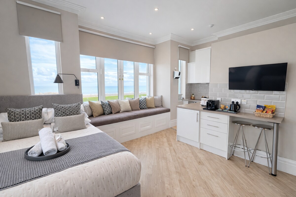 Estudio frente a la playa, frente a la playa de Littlestone, con vistas al mar. Compacto y con un diseño precioso, cuenta con una cómoda cama matrimonial, además de un colchón inflable individual y cojines para sentarse junto a la ventana. Mesa de comedor para dos. Cocina pequeña totalmente equipada con horno, encimera, microondas y lavadora/secadora. Aire acondicionado (frío y calor) y Smart TV. Ideal para parejas, viajeros solitarios y escapadas a la costa cerca de Dungeness, Rye y Camber Sands.