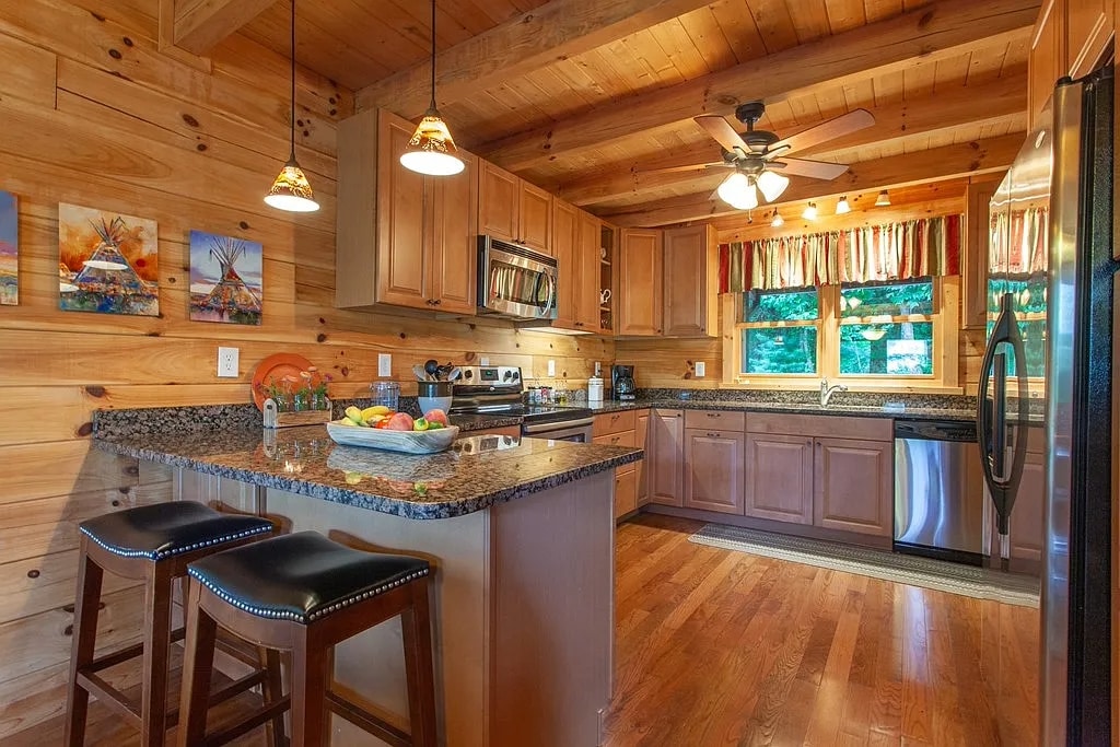 Una cabaña verdaderamente única con una pared de ventanas que te ofrece vistas espectaculares del lago Fontana y del Parque Nacional de las Grandes Montañas Humeantes, ya sea que estés en la sala de estar, la cocina o el comedor, o incluso arriba jugando al billar. Esta cabaña también tiene una larga entrada pavimentada que es perfecta para tus coches o motocicletas. Puedes pasar todo el tiempo relajándote en la cabaña, sin embargo, estás a solo 10 minutos de Tsali o del Centro al Aire Libre de Nantahala y a solo 15 minutos de la ciudad de Bryson.