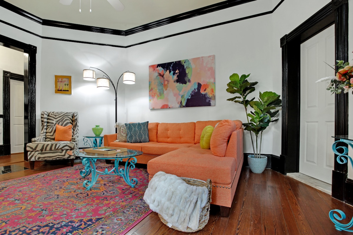 Te damos la bienvenida a la morada ecléctica. Ubicado a pocos pasos de Forsyth Park, este apartamento único ofrece la experiencia ecléctica que deseas en Savannah. El apartamento tiene un dormitorio y una cama futón, con capacidad para cuatro personas. La morada es un lugar perfecto para pasar el rato con una cocina completa, sala de estar y terraza privada, todo acentuado por colores divertidos y patrones vibrantes. A solo tres minutos a pie de Forsyth Park y rodeado de comida, dulces y actividades. SVR-02783