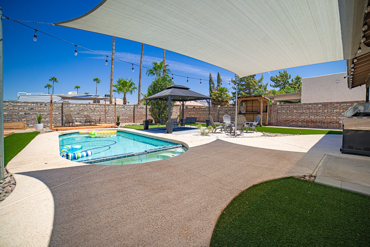 ¡Disfruta de tu estancia en esta moderna casa con piscina en Yuma! Esta propiedad cuenta con 2 amplias suites principales, cada habitación tiene una cama tamaño king y un sofá cama. La cocina tiene una placa de cocción y hornos de alta gama incorporados, también todos los electrodomésticos nuevos. La sala de estar es muy espaciosa. Garaje para 3 coches. Esta casa está cerca de la biblioteca Foothills, los campos de golf Foothills, la estación del sheriff y la I-8. ¡El exterior cuenta con chimenea, piscina, parrilla, zonas de estar, árboles frutales y mucho más! Gran alojamiento para relajarse y descansar.